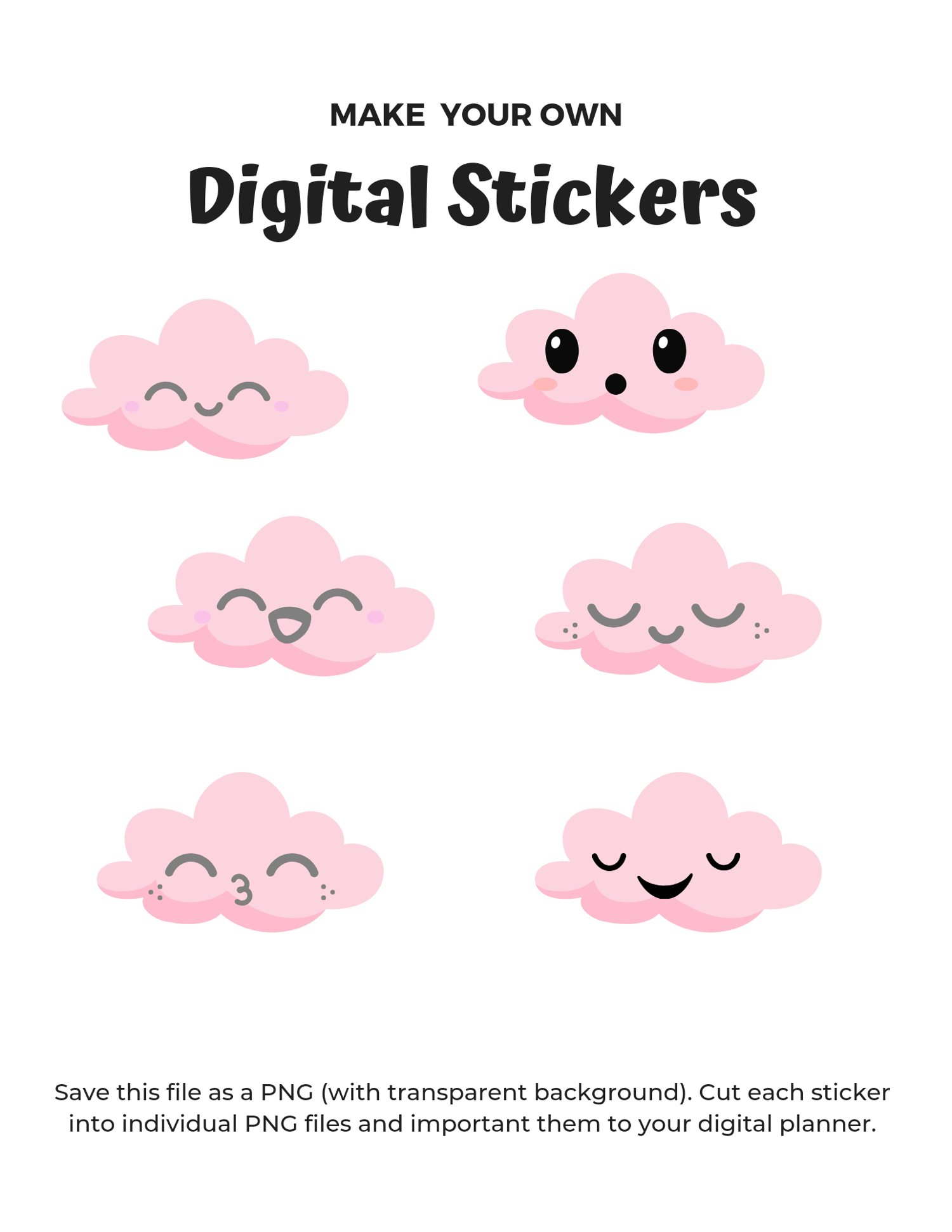 6 kawaii pink cloud with cute faces digital stickers. Instructions on page☁️