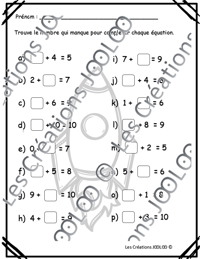 Voici 5 fiches pour pratiquer les termes manquants des additions de 0 à 10 sur le thème de l'espace.
