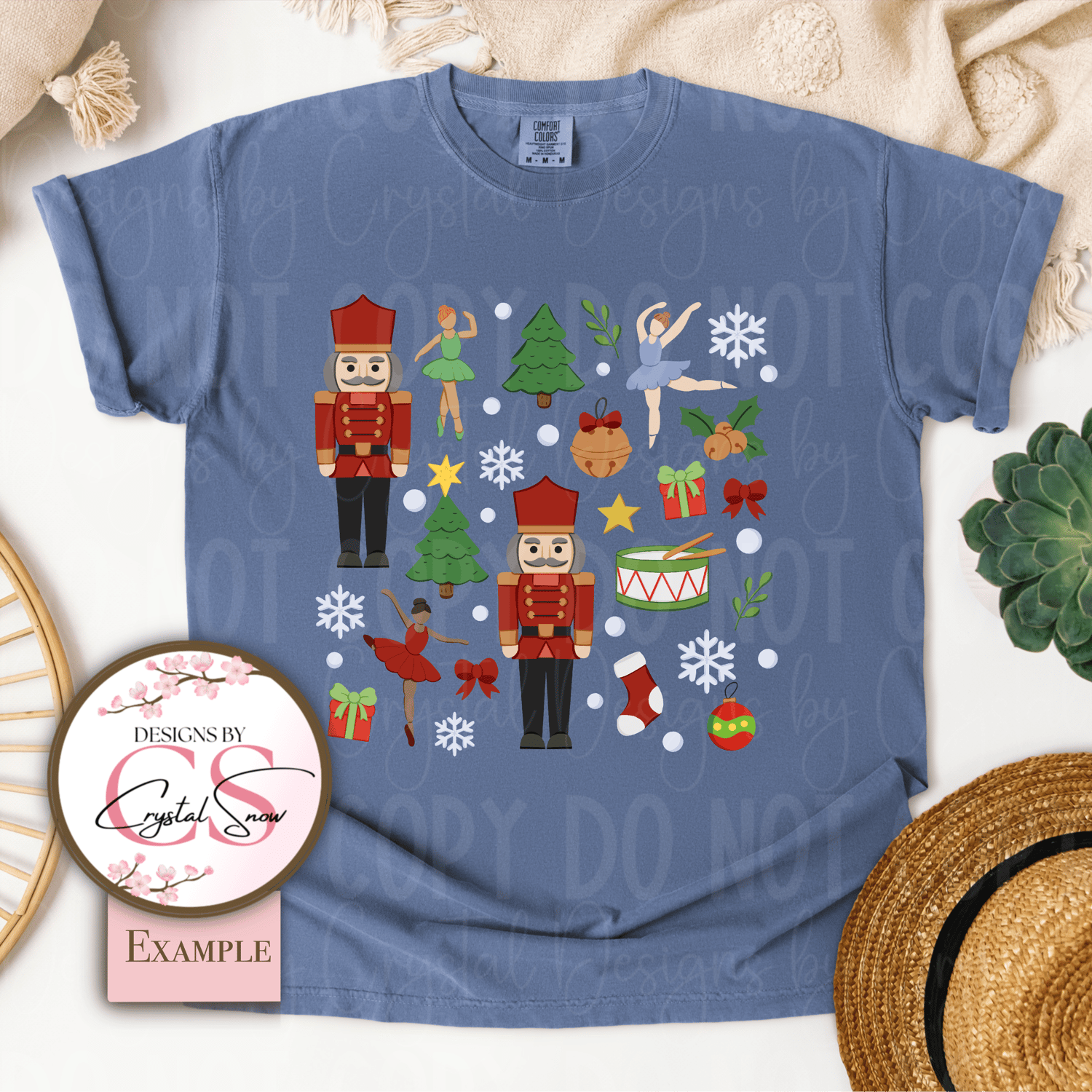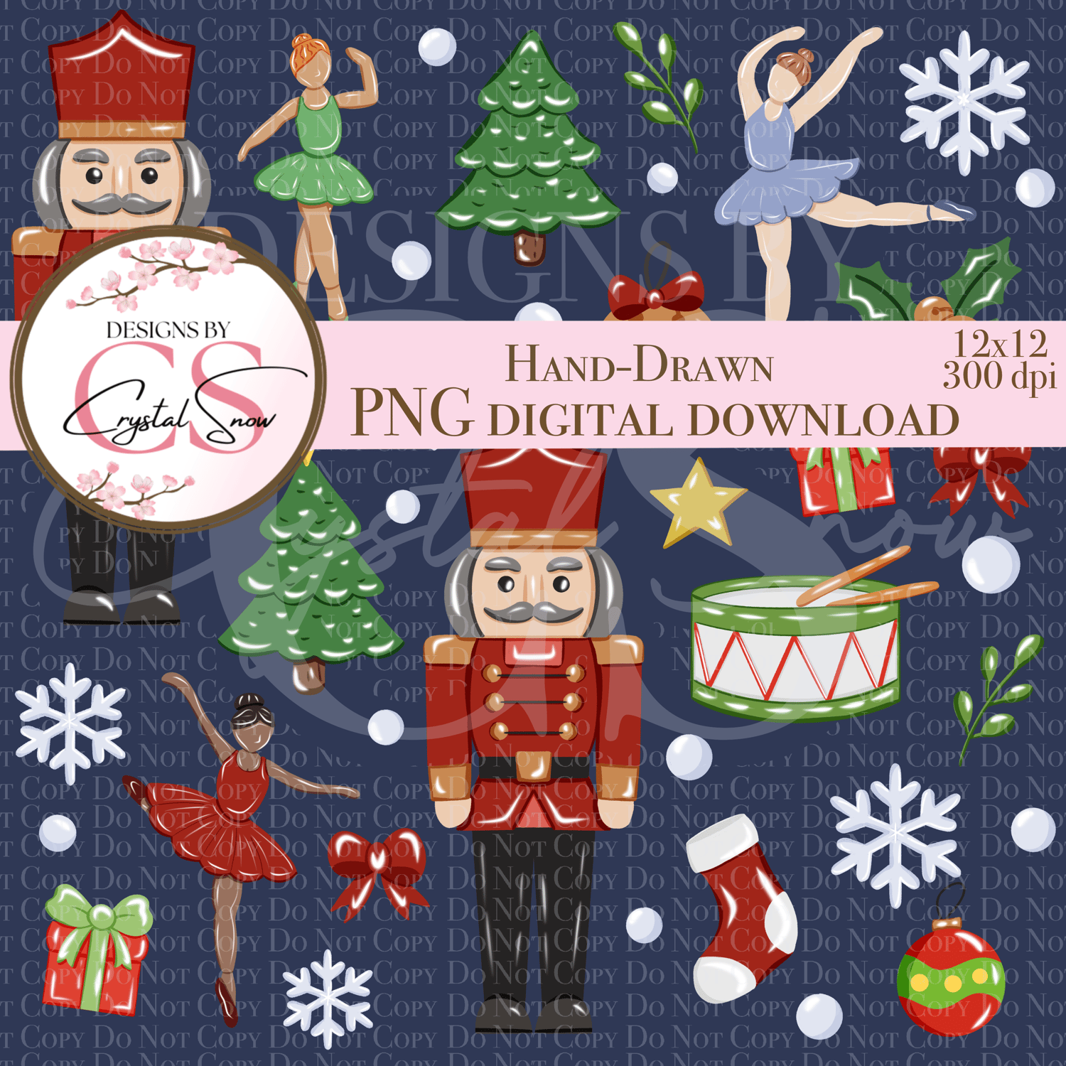 This Nutcracker Christmas PNG features detailed hand-drawn illustrations inspired by the classic holiday ballet. Every element is clean, crisp, and ready for printing on shirts, stockings, mugs, ornaments, bags, and more.