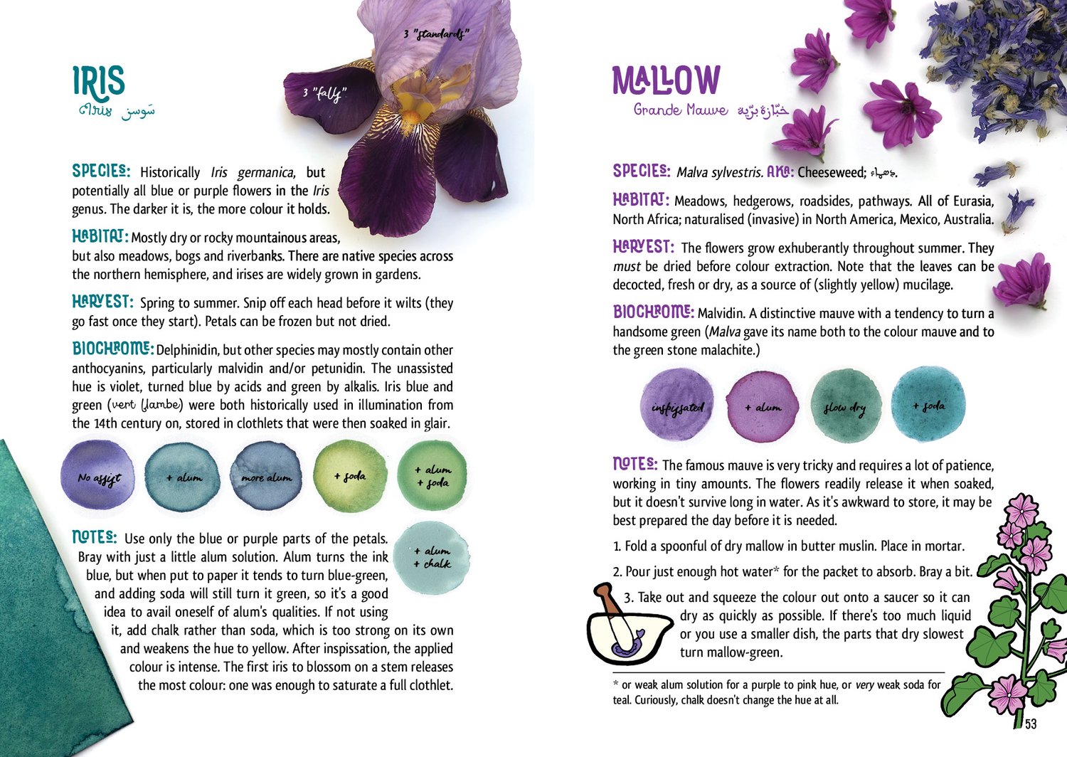 PART 2: PLANT COLOURS — Foraging ethics, Finding & storing, Plant colour chemistry, Dye extraction, Preservation (including making lakes and clothlets), The Colour year (50 plants, where to find them, what colours they yield and how best to work with them)