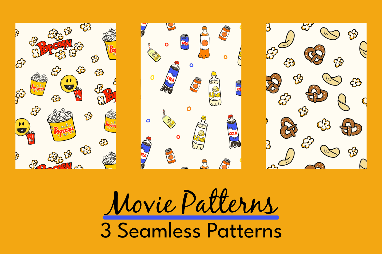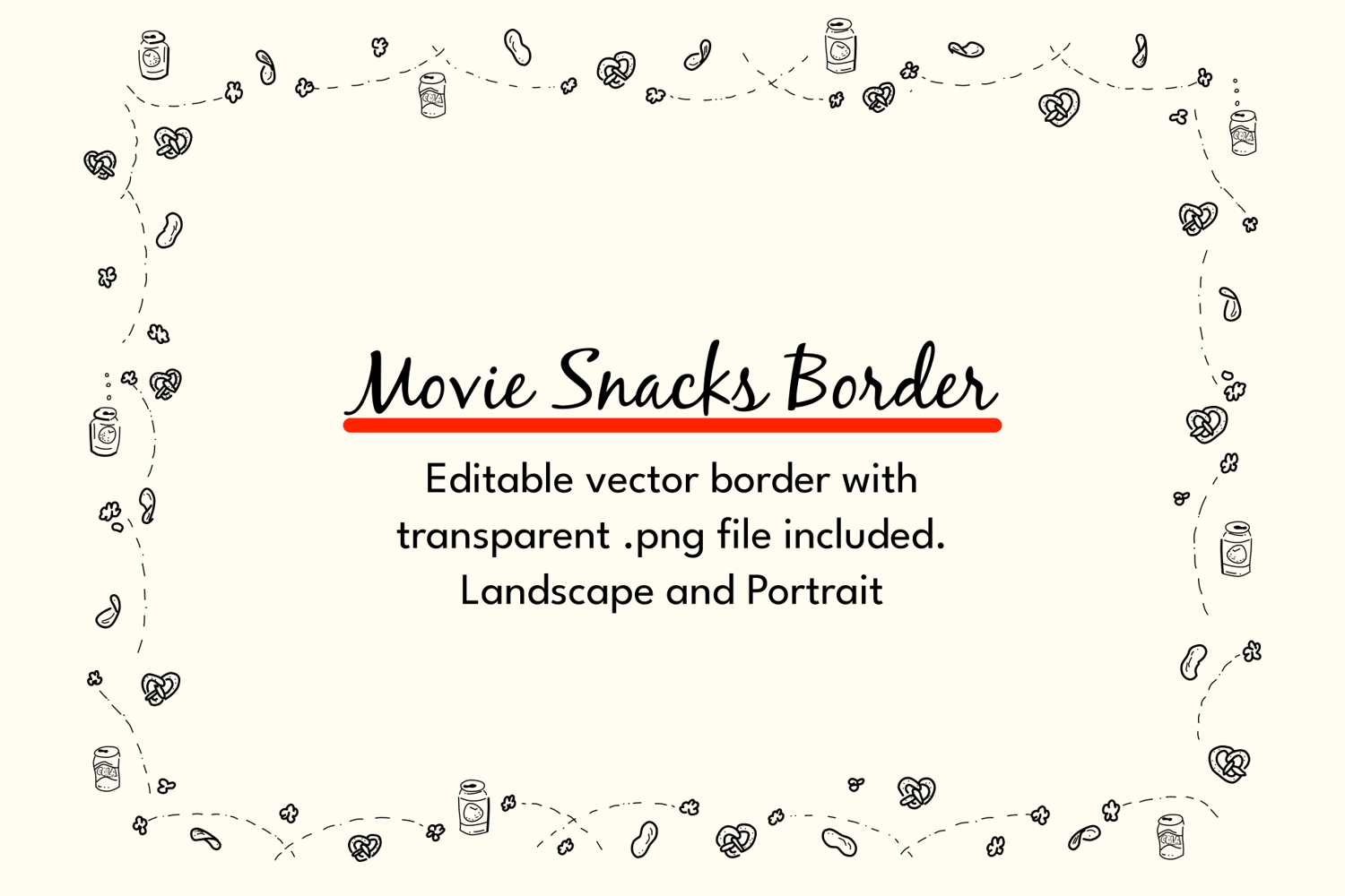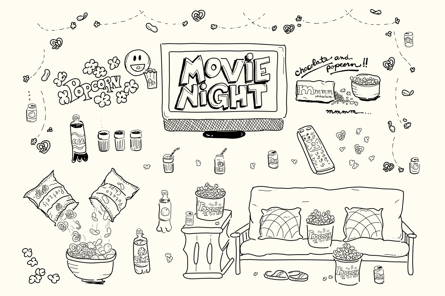 Our Movie Night Illustrations delivers a movie extravaganza to the comfort of your home. Our movie snacks are ready in this cozy living room scene. We have bags and bowls full of potato chips and pretzels, an exciting combo of sweet chocolate with salty popcorn, buckets and buckets of popcorn, and lots of soda to wash it all down. These snacks make the cutest doodles!