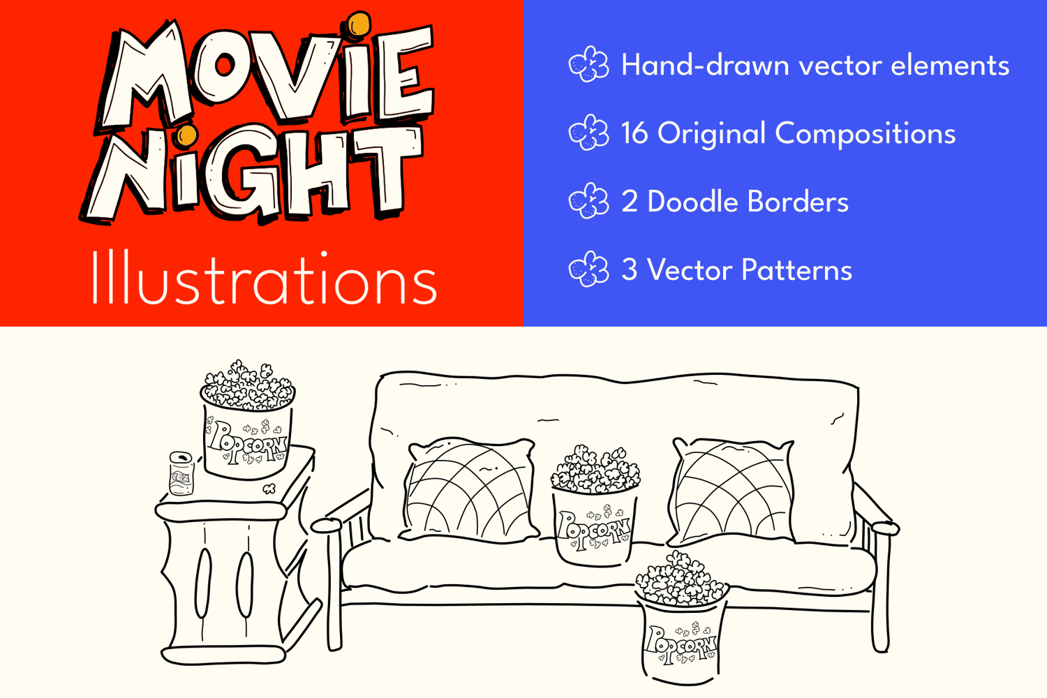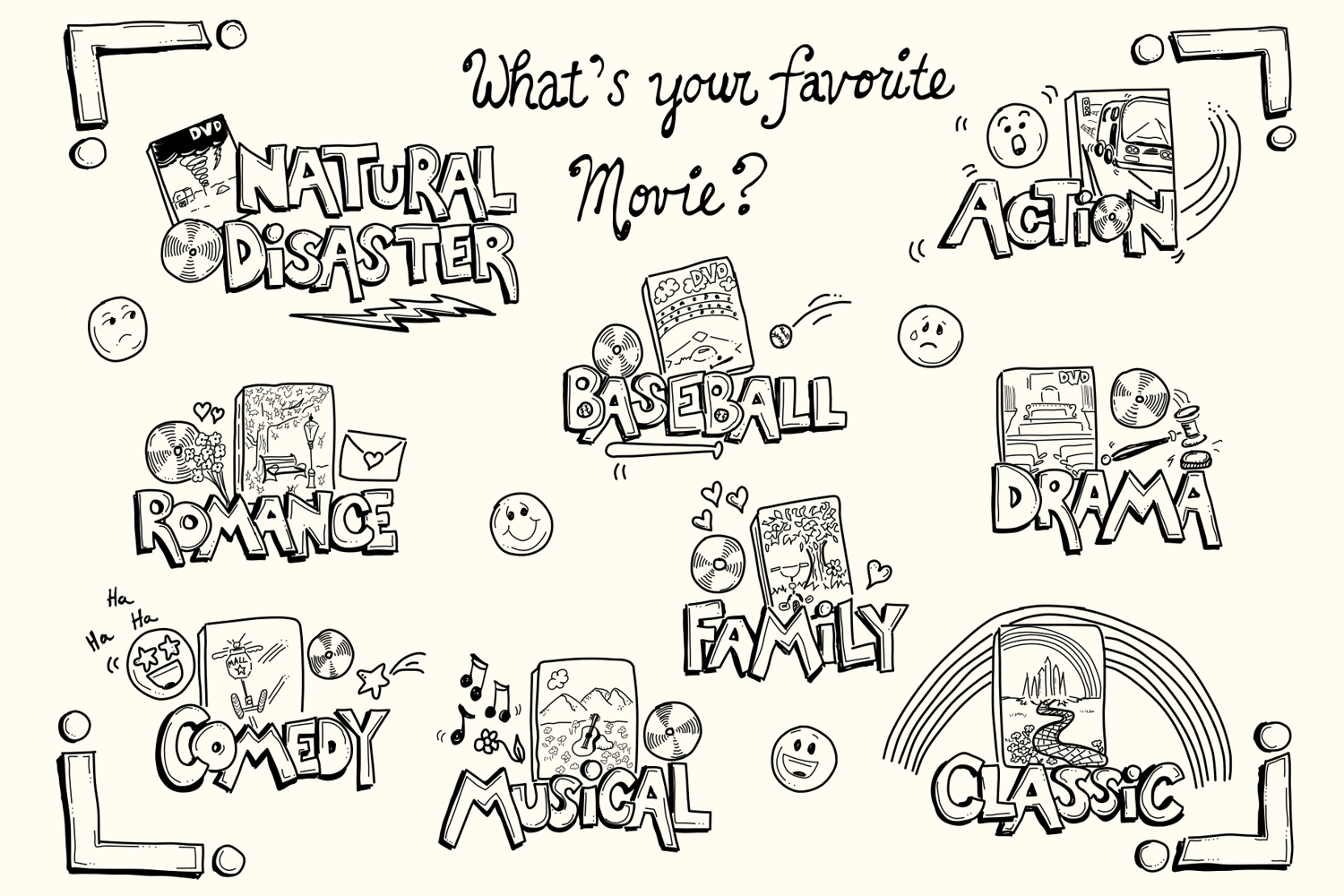 What is your favorite movie? We have plenty to choose from. Do you want action? We have action. Or do you prefer a drama or baseball movie? We have that too. How about a family movie or a romance? It's all in this entertaining Movie Night Illustrations package!