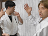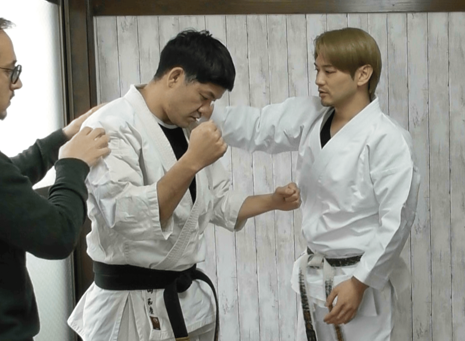 M.T. and Kazu are preparing for a Karate match. Every time they hit each other, they freeze in place. When both are frozen, I interact with them moving their bodies. M.T. Karate uniform is also taken.