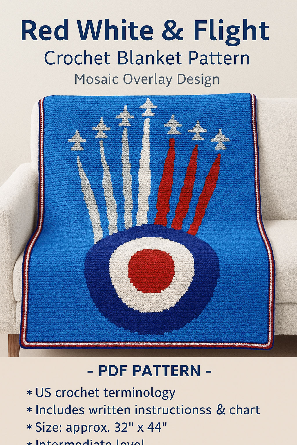 Take to the skies with the Red White & Flight crochet blanket pattern — a bold and beautifully detailed design celebrating flight, motion, and patriotic flair. Worked using the mosaic overlay technique, this eye-catching blanket features seven stylised jet silhouettes in perfect formation, each trailing striking streams of red, white, and grey against a vivid blue background. The bold roundel motif at the base adds a powerful focal point, evoking classic aviation insignia.