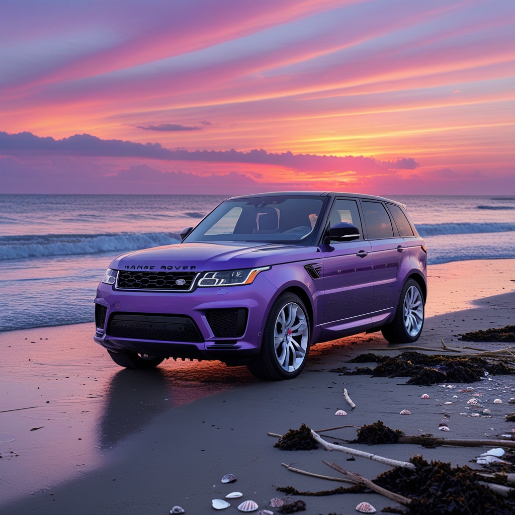 A stunning metallic violet Range Rover Sport parked on a serene beach at low tide, with gentle waves lapping at the shore, as a breathtaking sunset unfolds in the background, casting a warm orange-gold light across the scene. The luxurious SUV's sleek, angular lines and gleaming violet finish appear radiant against the vibrant hues of the sky, where soft pink and purple clouds are streaked across the horizon. The beach itself is lined with scattered shells and seaweed, with a few driftwood sticks strewn about, creating a sense of rustic serenity. In the distance, the sun dips below the horizon, leaving a trail of fiery colors that reflect off the Range Rover's metallic surface, creating an eye-catching contrast between the man-made beauty and the natural wonder of the setting.