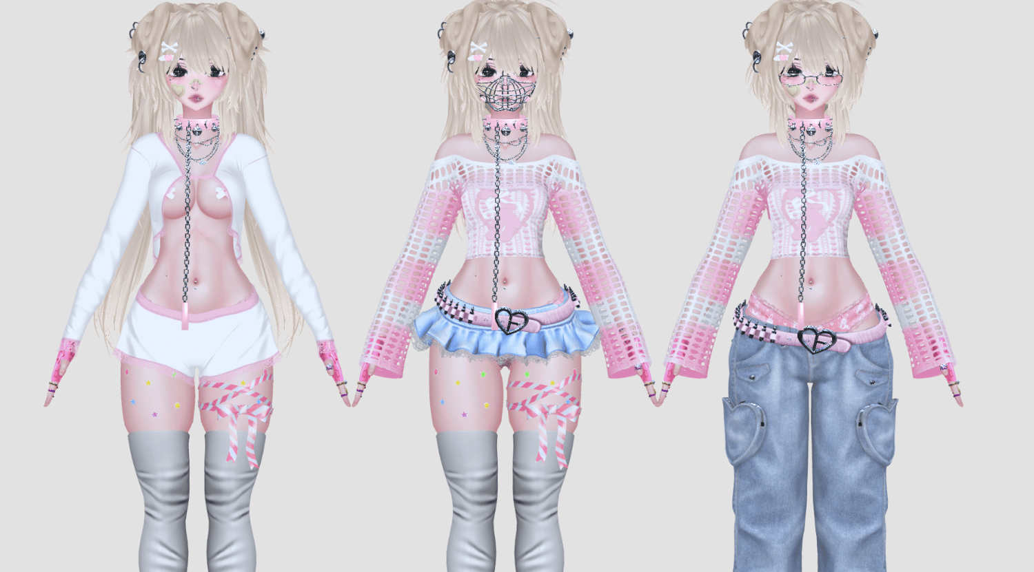 Boots | Skate Shoes | Sweater | Cargo Pants | Garter | Panties | Pasties | Pj Shorts | Pj Top | Shorts | Skirt | Socks | Tube Top | Sweater texture radials | Chunky Collar | Muzzle | Leash | Ears | Tail | Treat | Bun Hair | Pigtails | Side Hair Strands | 3 Bang Options | 4 Back Hair options | Bandaid | Bandaid 2 | Belly Piercing | Bracelet | Gloves | Rings | Earrings | Glasses | Necklace 1 | Necklace 2 | Nip Piercings | Nose Piercing | Piercings | Septum | Stickers |