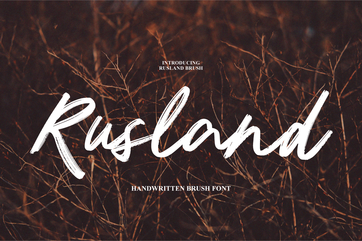 Rusland Brush is a typeface with personality. You can use it as a logo, badge, insignia, packaging, headline, poster, etc The alternative characters in this font were divided into several OpenType features such as Stylistic Alternates, Stylistic Sets, and Ligature. The OpenType features can be accessed by using OpenType program such as Adobe Illustrator, Adobe Photoshop, and Adobe InDesign.