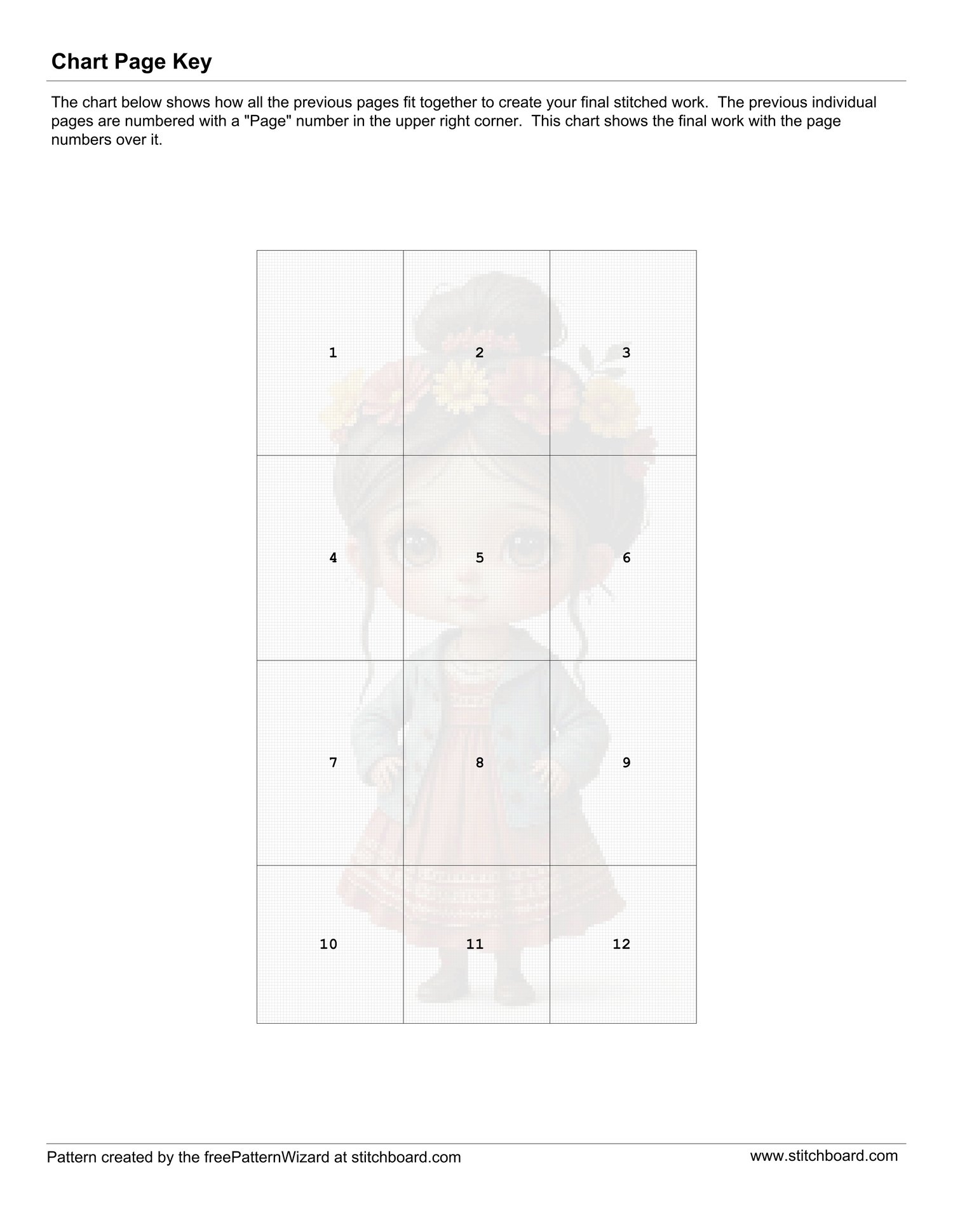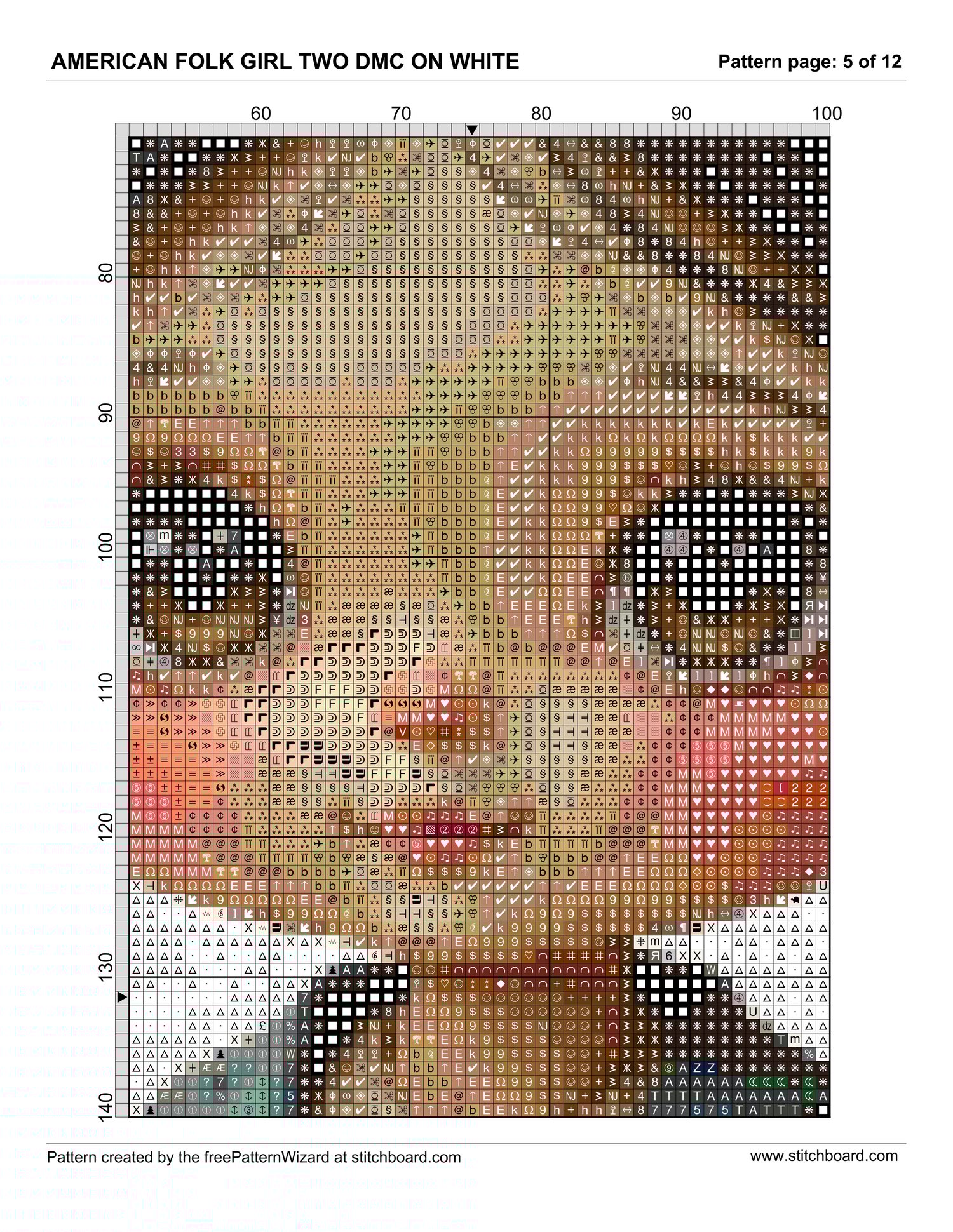 2 cross stitch patterns of the little Folk Girl on a light coffee background for both DMC and Anchor cottons.