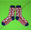 Method: Featuring motifs of baseballs, bats, and popcorn and with baseball diamonds on the sole, these stranded colorwork socks are knit in the round from the cuff down. They have a round heel and options to knit two leg lengths and customise the depth of the gusset.