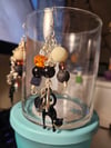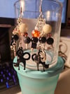 A multi tiered asymmetrical earring set with big black kitties with yellow eyes being the statement of the piece. The set its a mix of black and orange. With accents of white and dark blue.