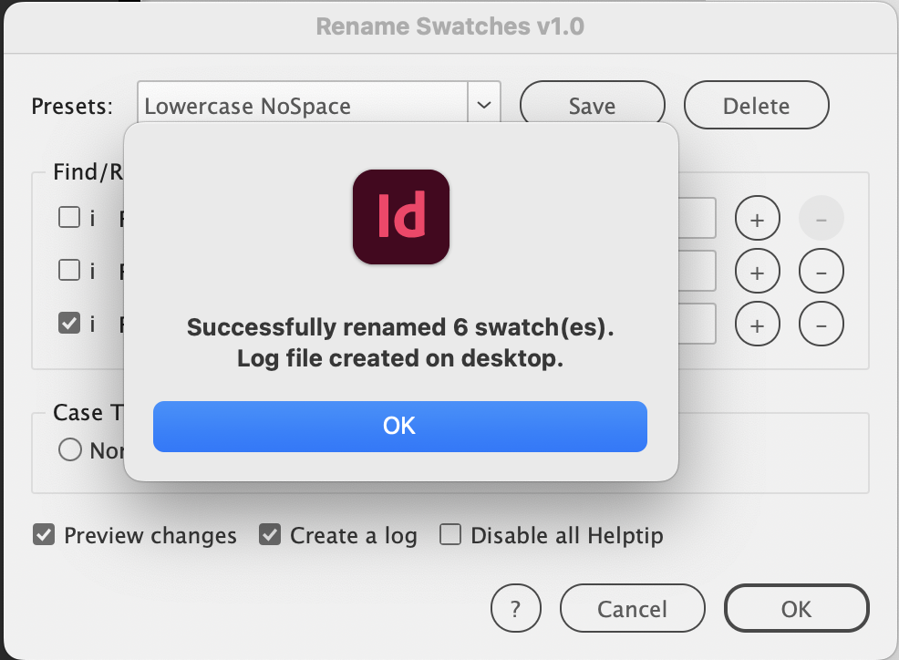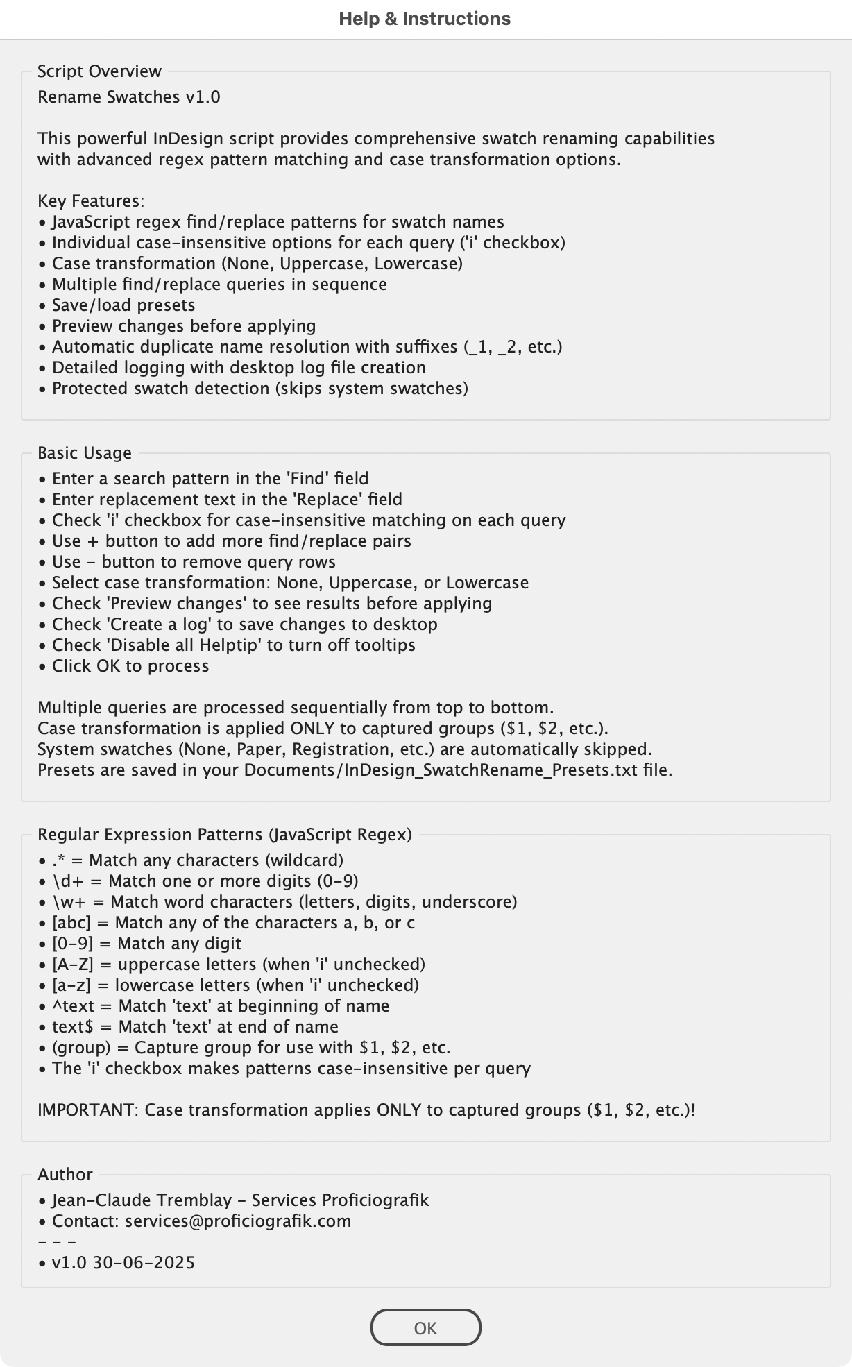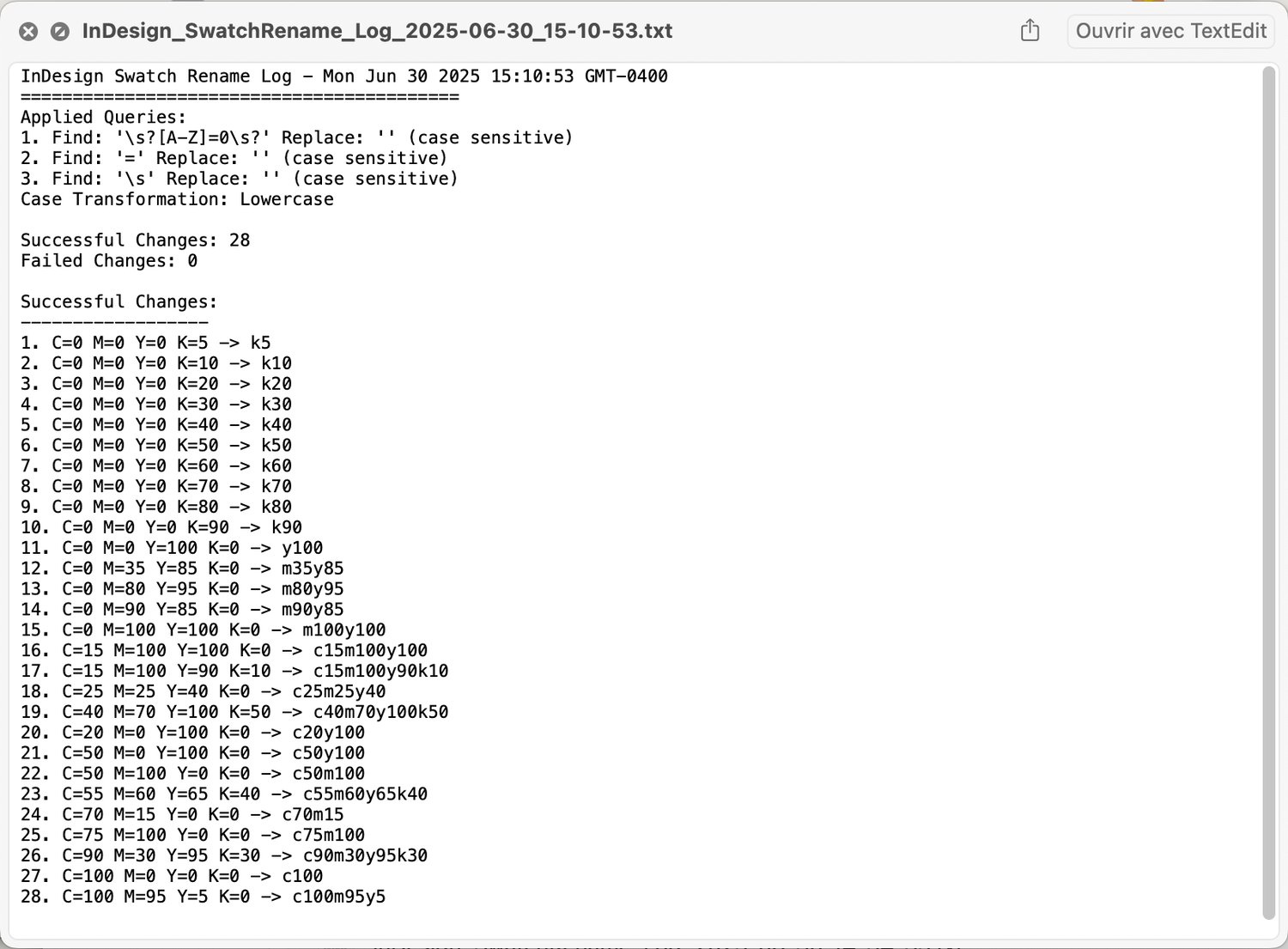 Rename Swatches is a powerful script that automates the tedious process of renaming multiple swatches using text or advanced JavaScript regular expression patterns. Instead of manually renaming swatches one by one, users can process entire swatch libraries in seconds with sophisticated pattern matching and replacement capabilities.