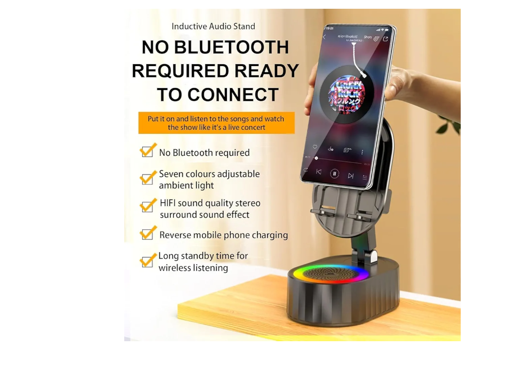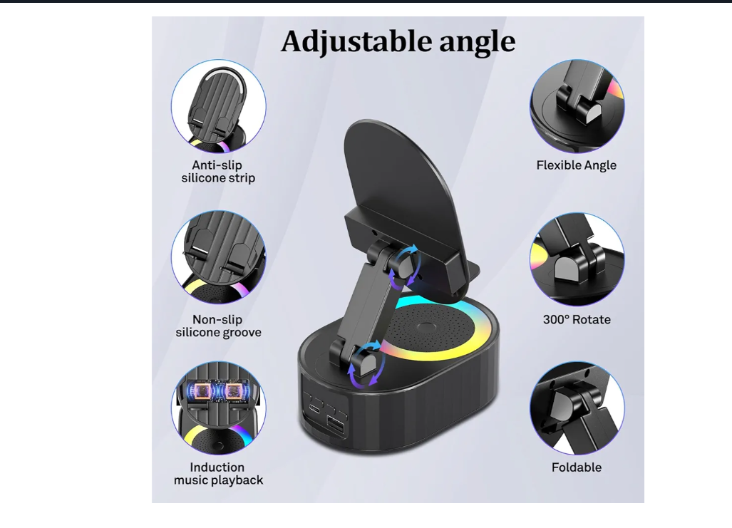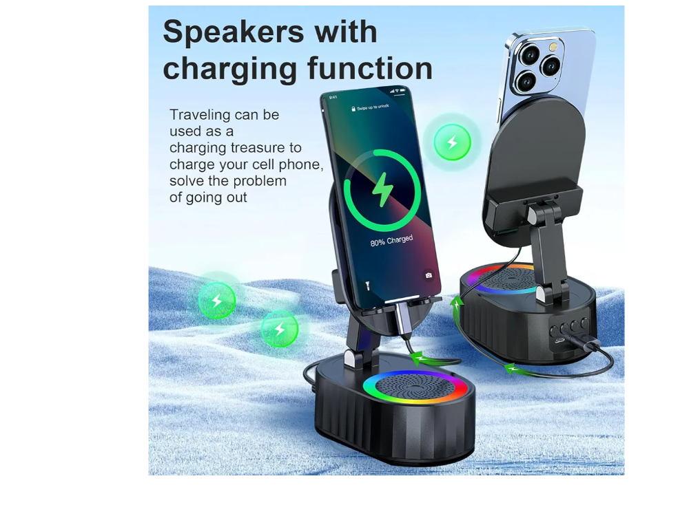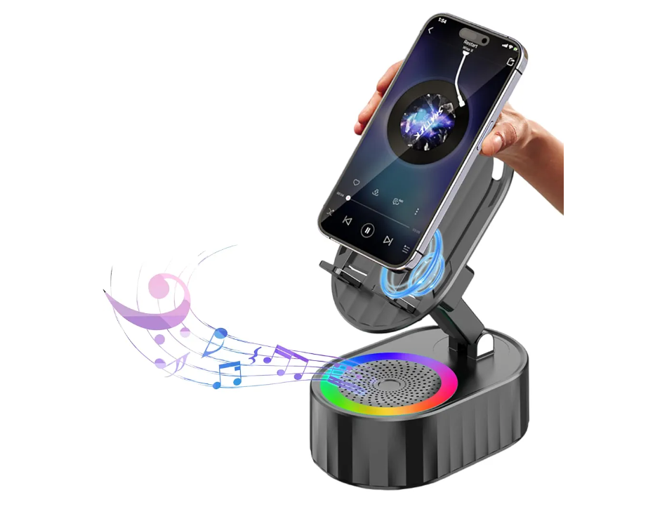 Wireless Induction Audio Bluetooth Speaker 5in1 Phone Holder Emergency Rechargeable (3000mAh) with Colorful Ambient Light 300° Foldable for Tablet iPhone Android, Gifts for Men Women (Black)