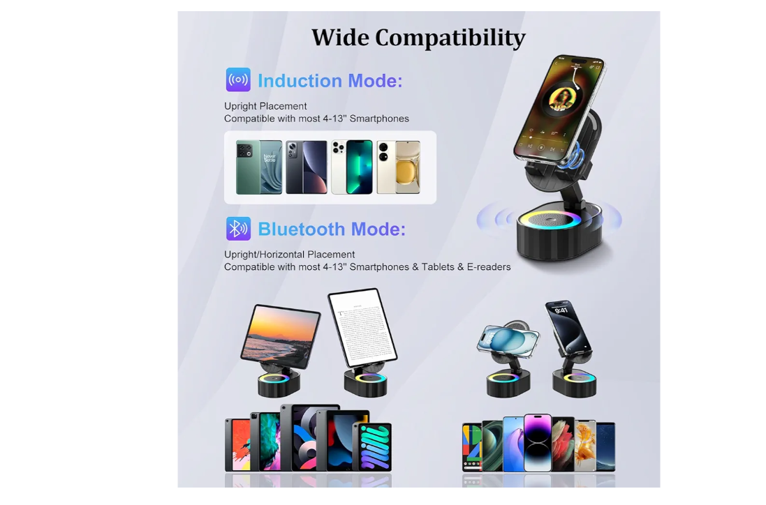 [Features a unique and fun 5-in-1 design]: A multifunctional device that combines wireless induction speaker, bluetooth speaker, charging, cell Phone Stand, and ambient light, with a built-in 5W power speaker that delivers high-definition stereo surround sound at any volume level for an enhanced audio experience. Our upgraded Bluetooth speaker comes with a USB port for charging in case of emergencies.