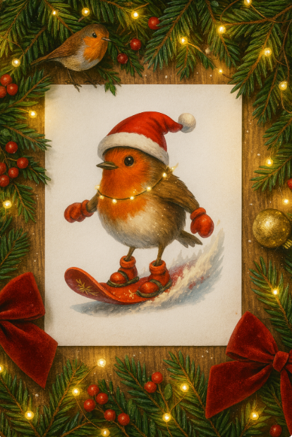 ake your holiday designs to the next level with this Luxury Christmas Robin Snowboarding PNG! π