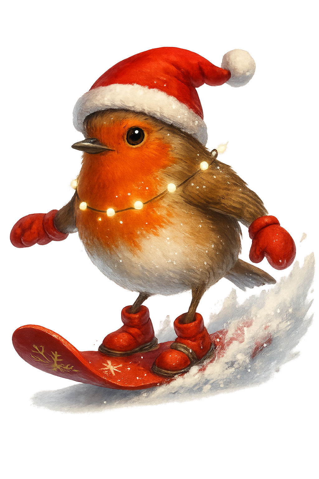 This adorable, high-resolution PNG features a festive robin with a Santa hat, red gloves, and red snow boots, snowboarding through a magical winter scene with glowing white festive lights wrapped around its neck.