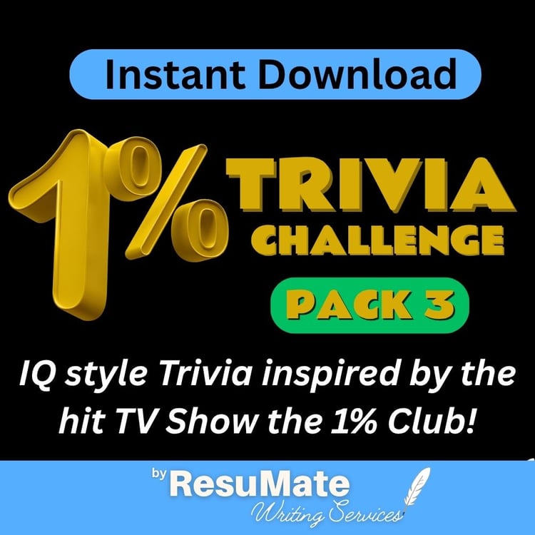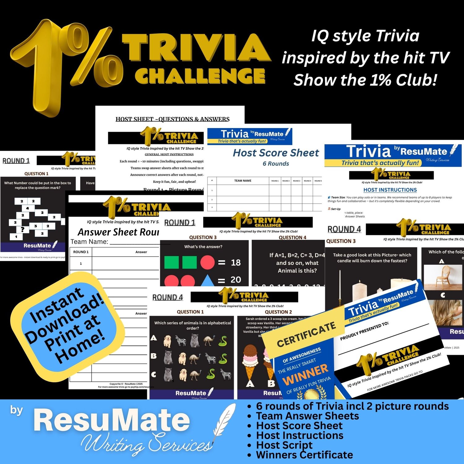 Think you’ve got what it takes to be in the top 1%? Put your logic, lateral thinking, and problem-solving skills to the test with this 1% Club Style Trivia Challenge Pack! Inspired by the hit TV show, this printable quiz set is perfect for game nights, team-building events, classrooms, or just challenging your smartest friends.