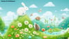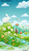 White rabbit at the top of a hill looking down at a hedgehog. There is a tortoise, humming birds, & flowers.