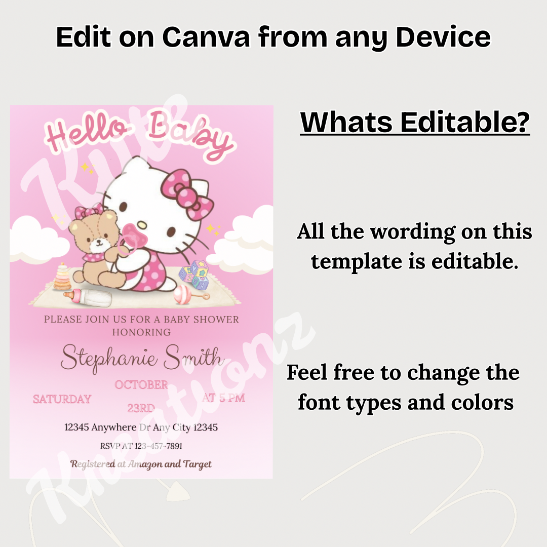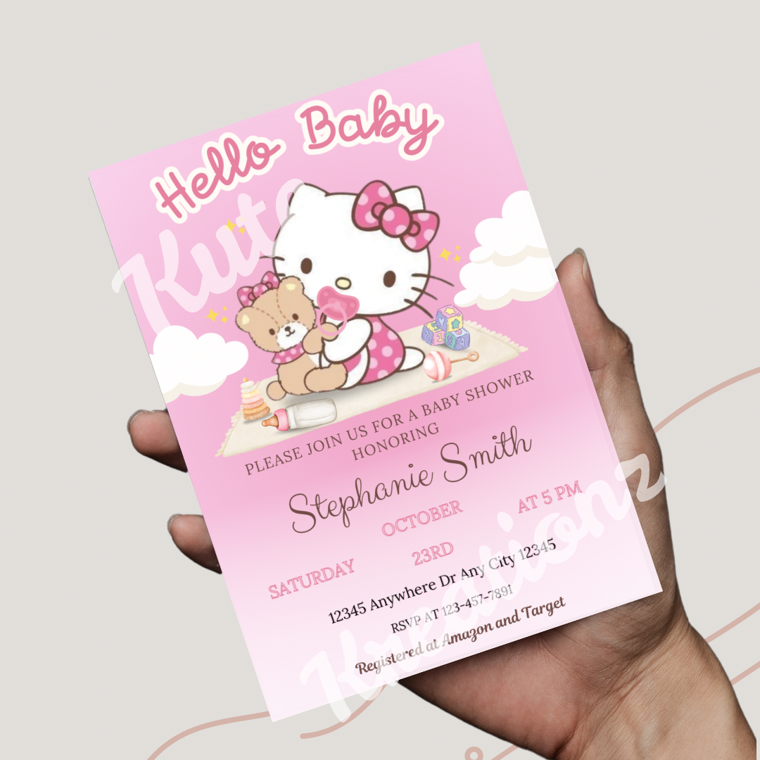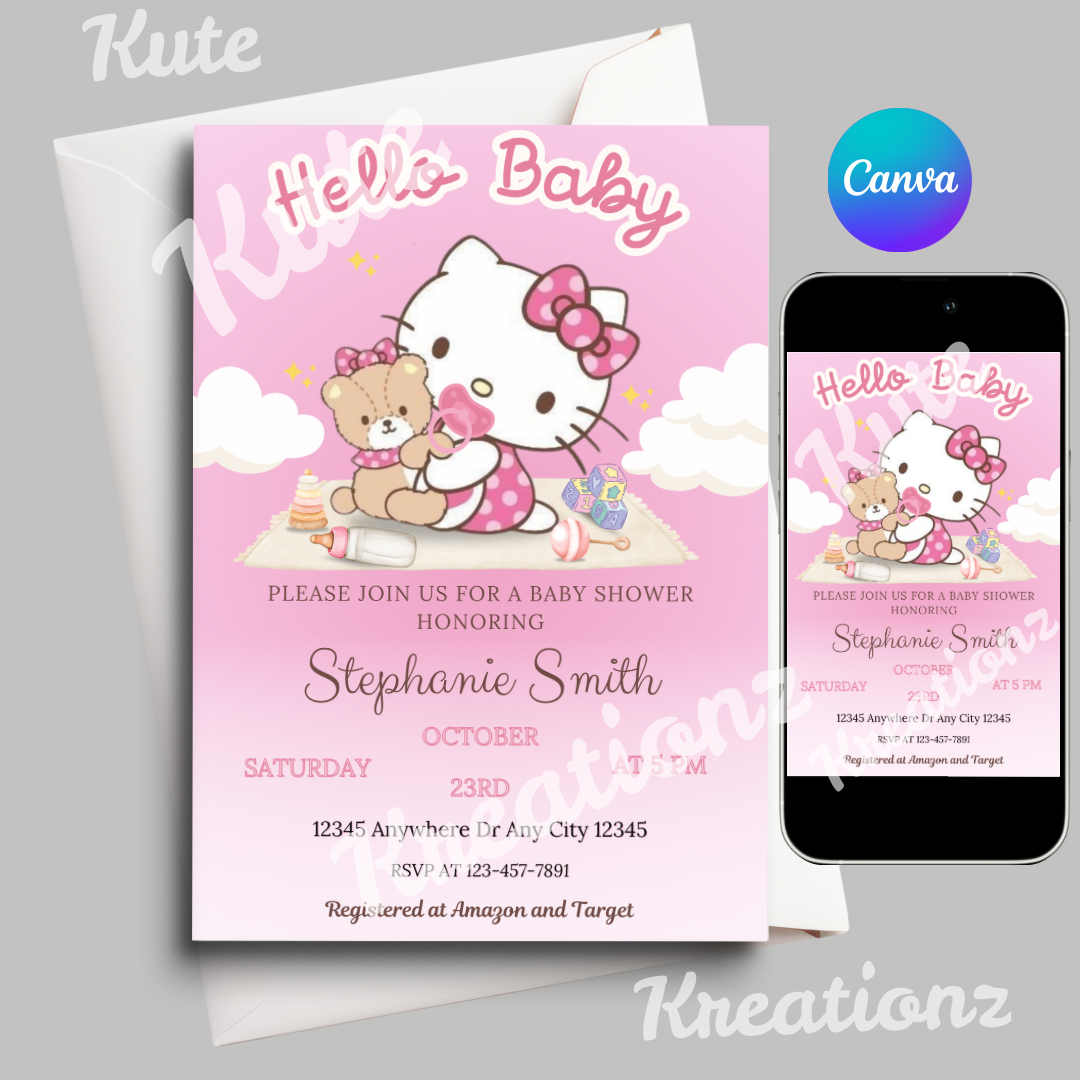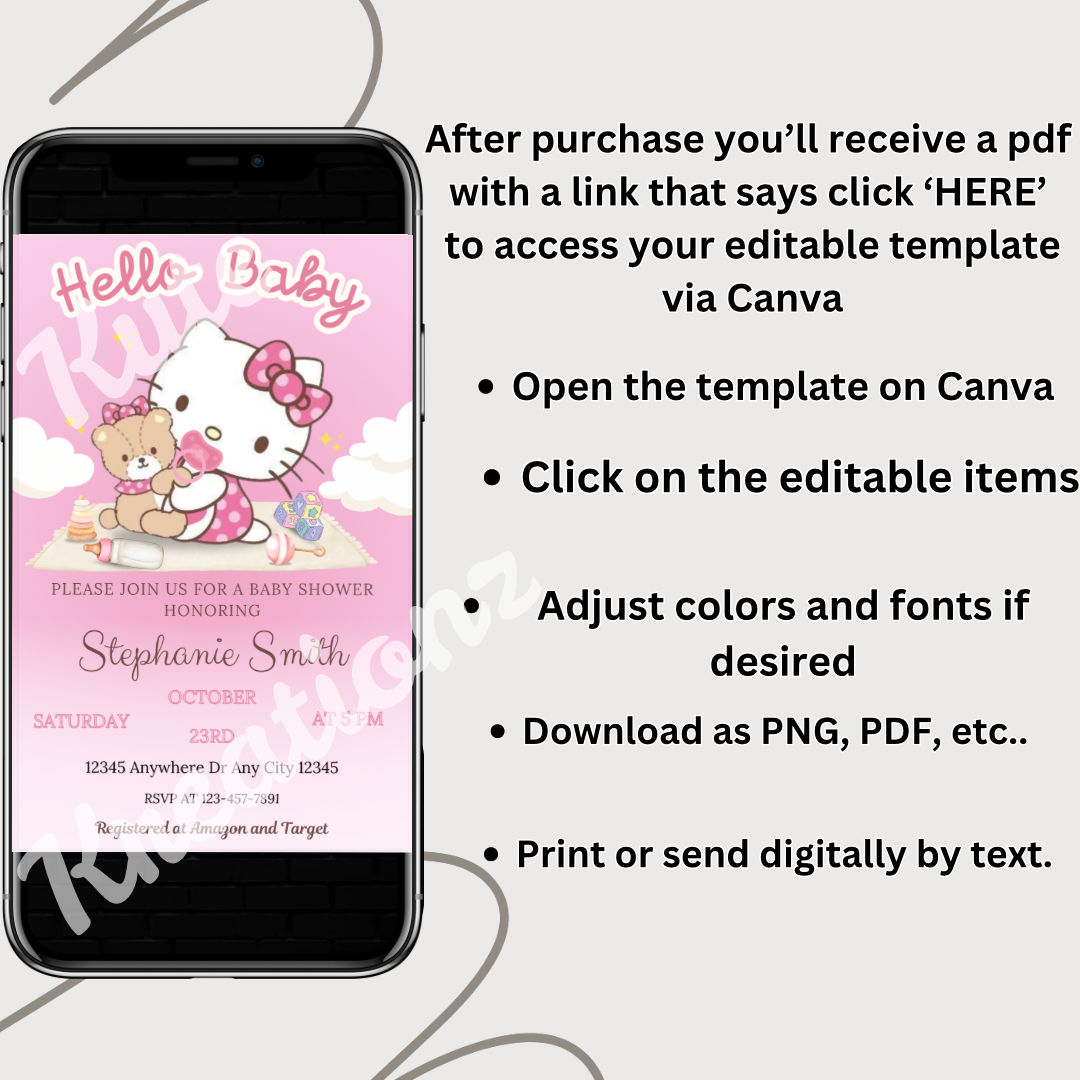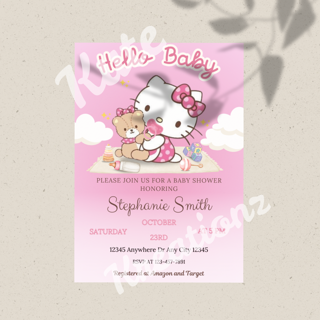 Celebrate your special baby shower with our adorable Kitty baby shower invitation! This is a digital product — no physical item will be shipped.