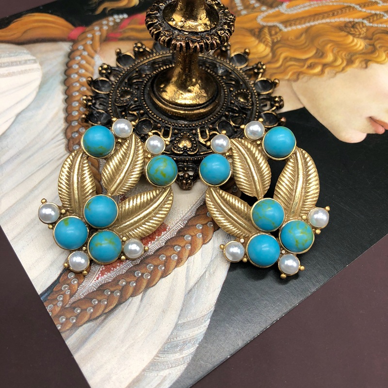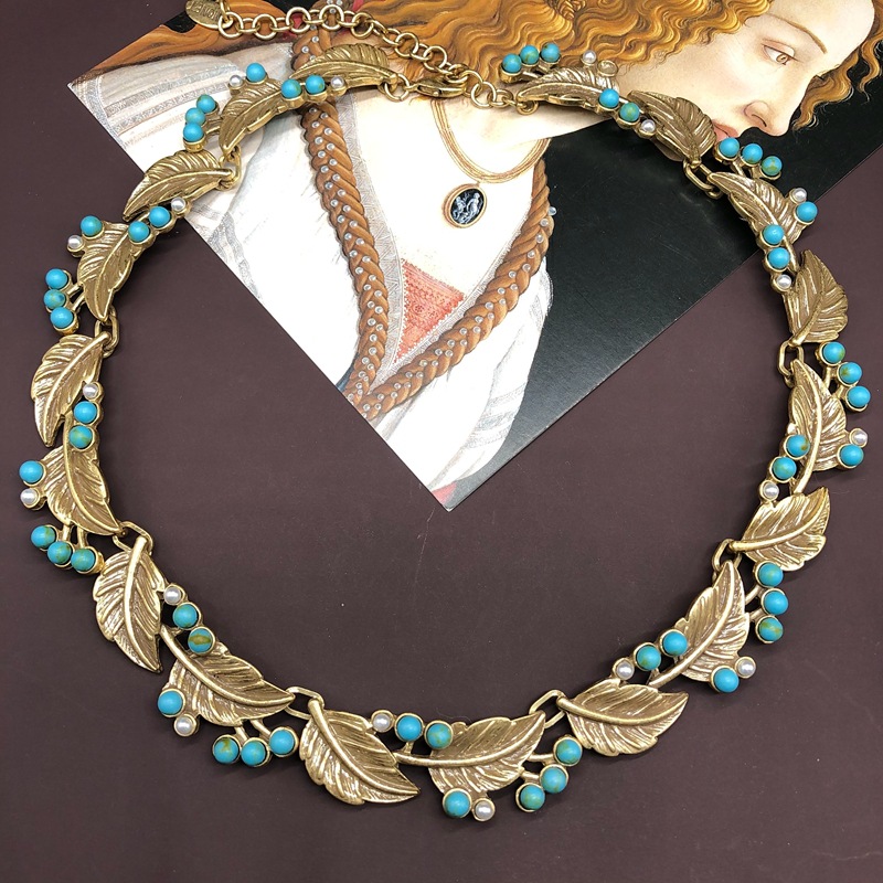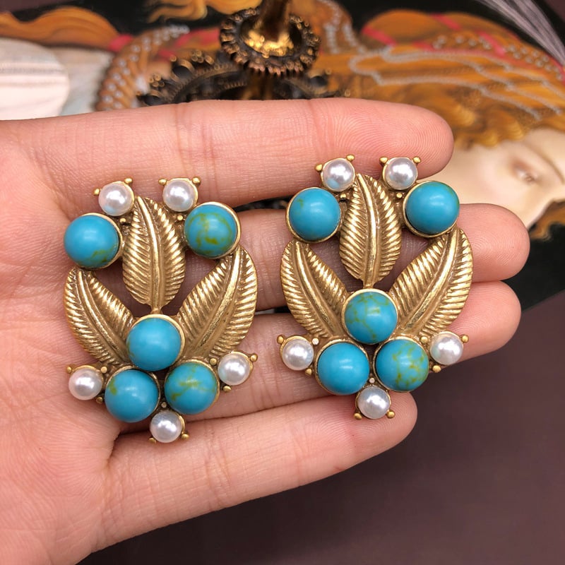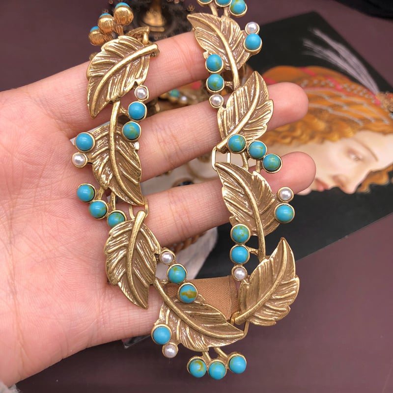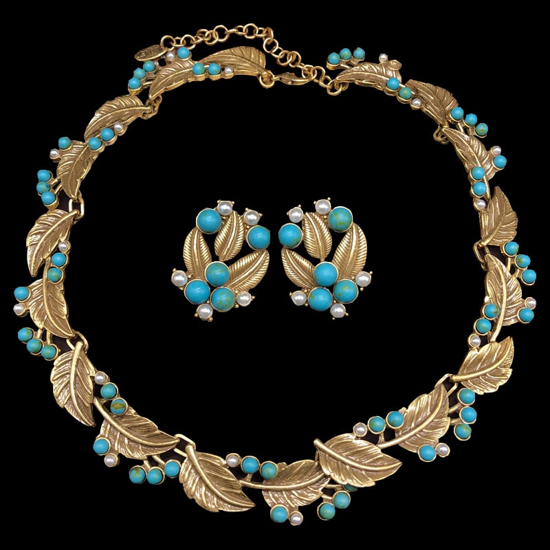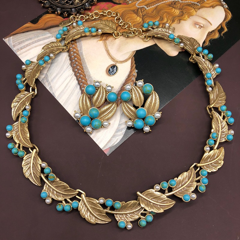 French vintage turquoise leaf pearl stud earring necklace set