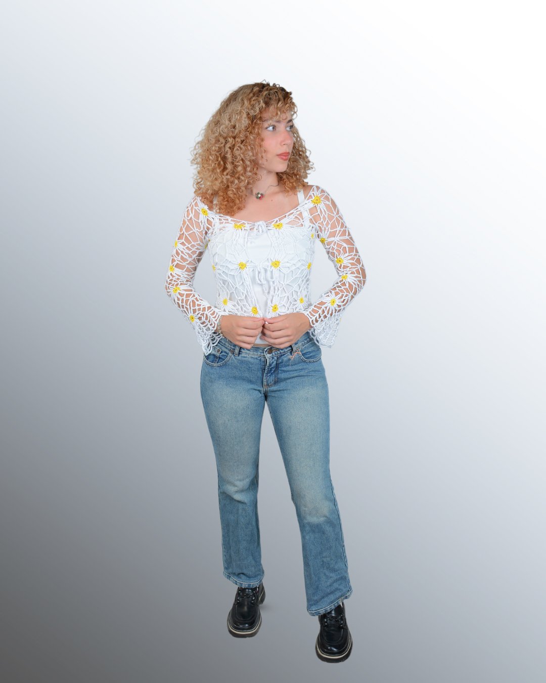 Although this piece follows an existing square motif, it is truly one of a kind — designed with my own vision and inspired by a few beautiful creations I found on Pinterest. The Daisy Top carries a sense of lightness and softness, bringing together a gentle mix of texture and charm. Its floral elements and airy design evoke the warmth of summer days and the simplicity of handmade beauty.