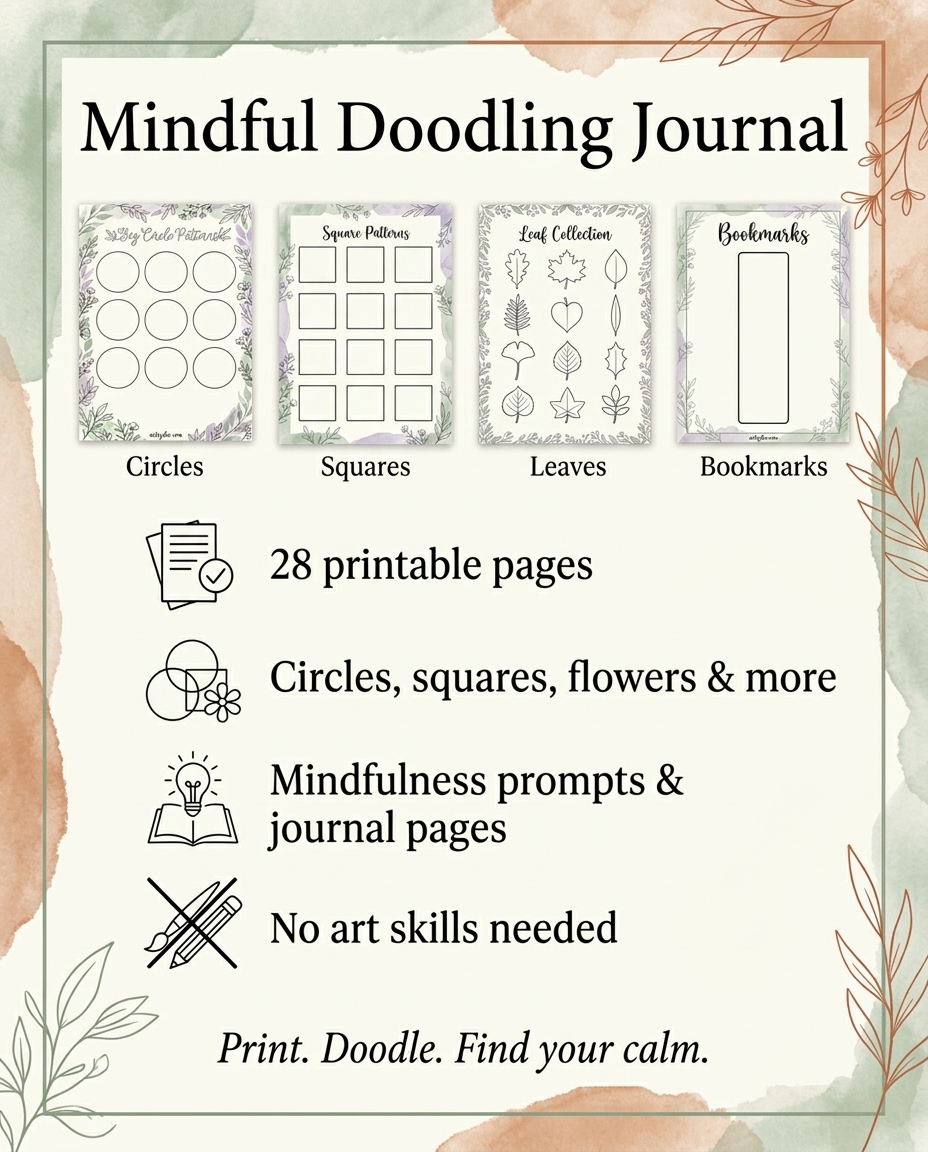 The Mindful Doodling Journal gives you 25 pages of guided, science-backed doodling worksheets to reduce stress, quiet a busy mind, and build a simple creative habit — no art experience needed.