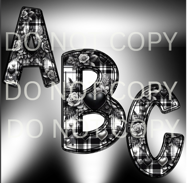 BLACK N WHITE ROSES N HEARTS Doodle Alphabet