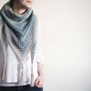 The shawl is worked top-down, starting with a garter tab from the center of the triangle. There are four increases worked on every RS row, one next to the three-stitch garter edging at the beginning and end of the rows, and one on each side of the center stitch.