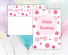 The interior of the card is blank for your own message! The back of the card is covered with the same pink polka dot design.