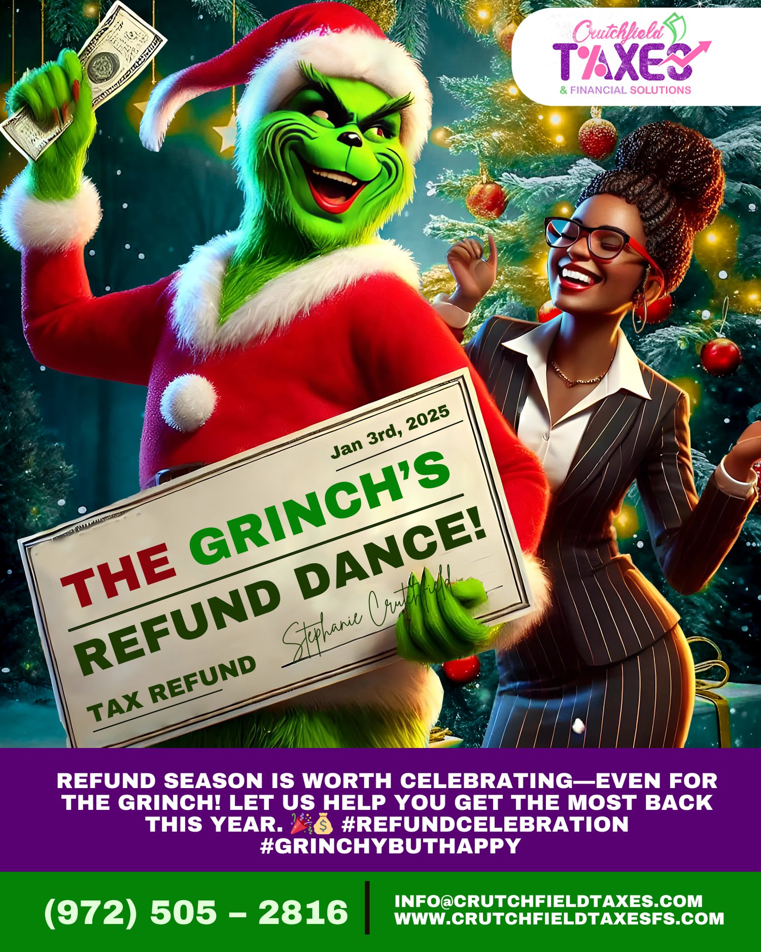 Make tax season fun with ‘The Grinch’s Refund Dance!’ Template – an easy-to-use digital template to create festive, engaging content that brings humor and excitement to refunds.