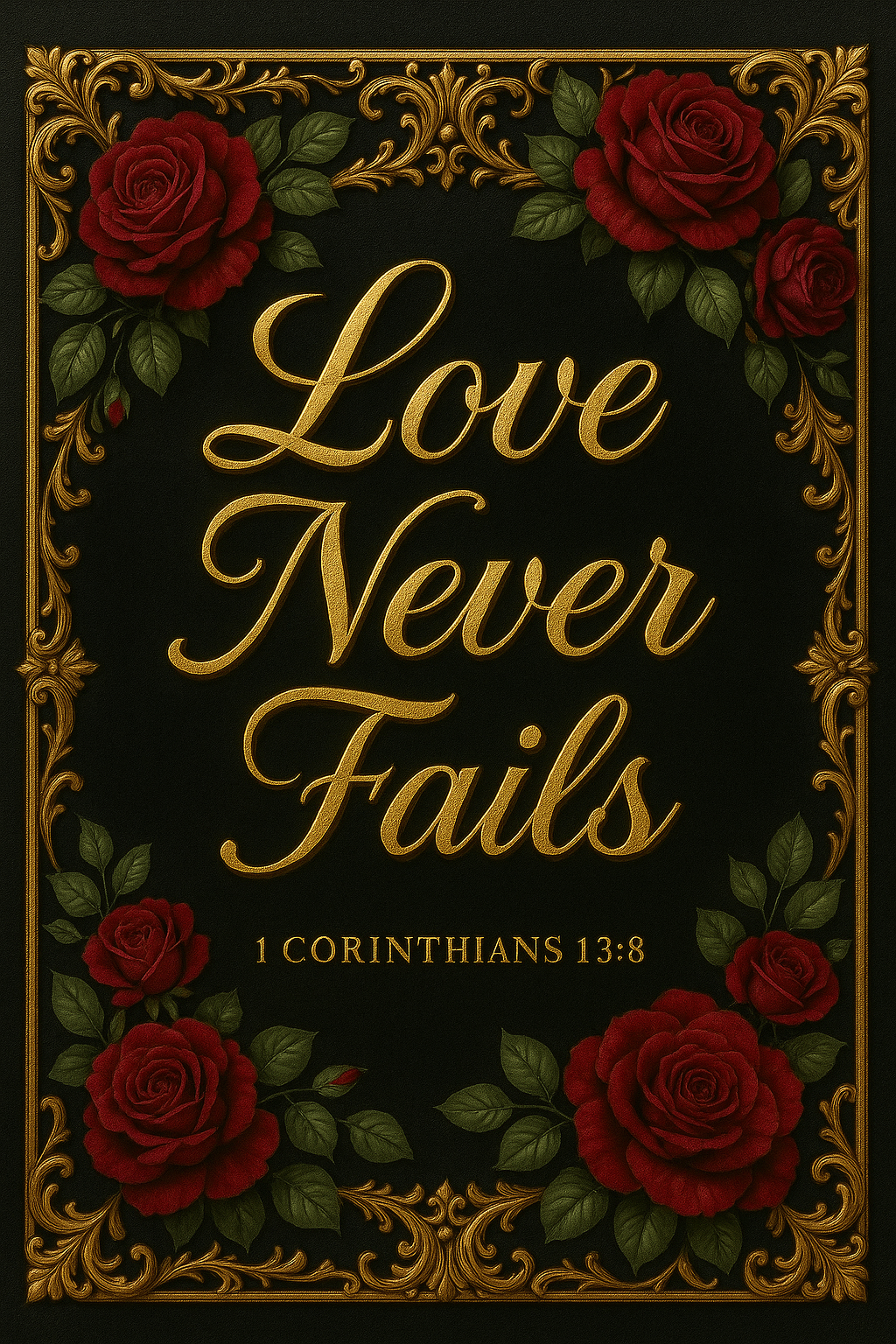 Celebrate timeless love with this Christian wall art featuring 1 Corinthians 13:8. Designed with a black background, golden script, and red roses, this printable affirms that love never fails. Perfect for weddings, anniversaries, and devotional spaces.