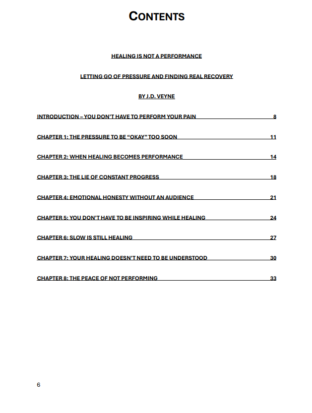 In Healing Is Not a Performance, J.D. Veyne challenges the cultural pressure to make recovery visible, inspirational, or “marketable.” This book is a reminder that real healing doesn’t have to be graceful, public, or fast — it only has to be real.