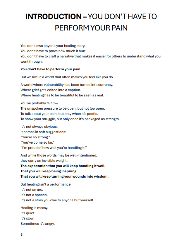 For readers of Brené Brown, Glennon Doyle, and Pema Chödrön, Healing Is Not a Performance offers a clean, reflective space — one where your healing belongs to you, and you alone.