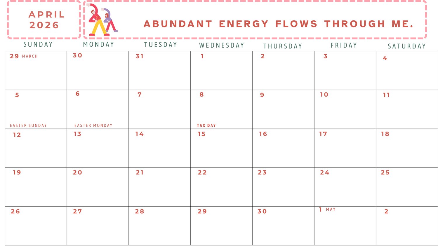 2026 Calendar with affirmations for your physical fitness. pdf download.