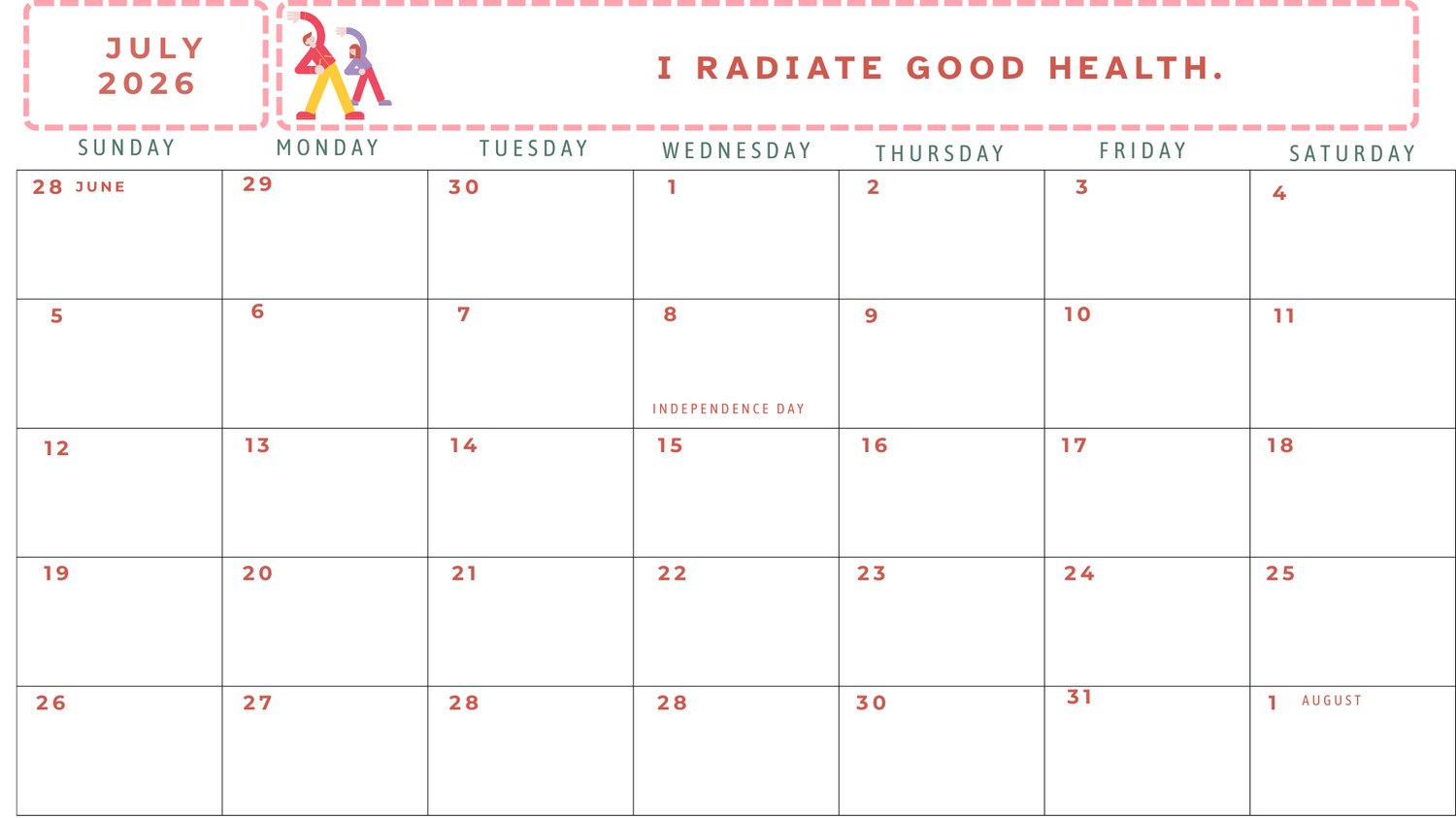 2026 Calendar Health and Physical Fitness Affirmations