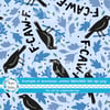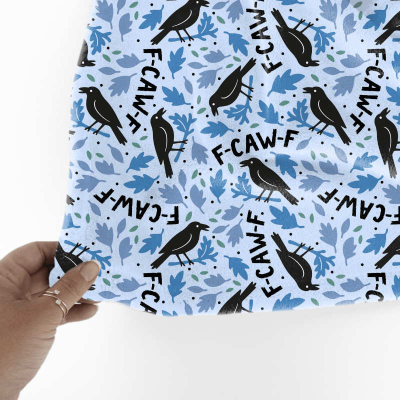 Sarcastic black birds saying F-CAW-F! on blue.