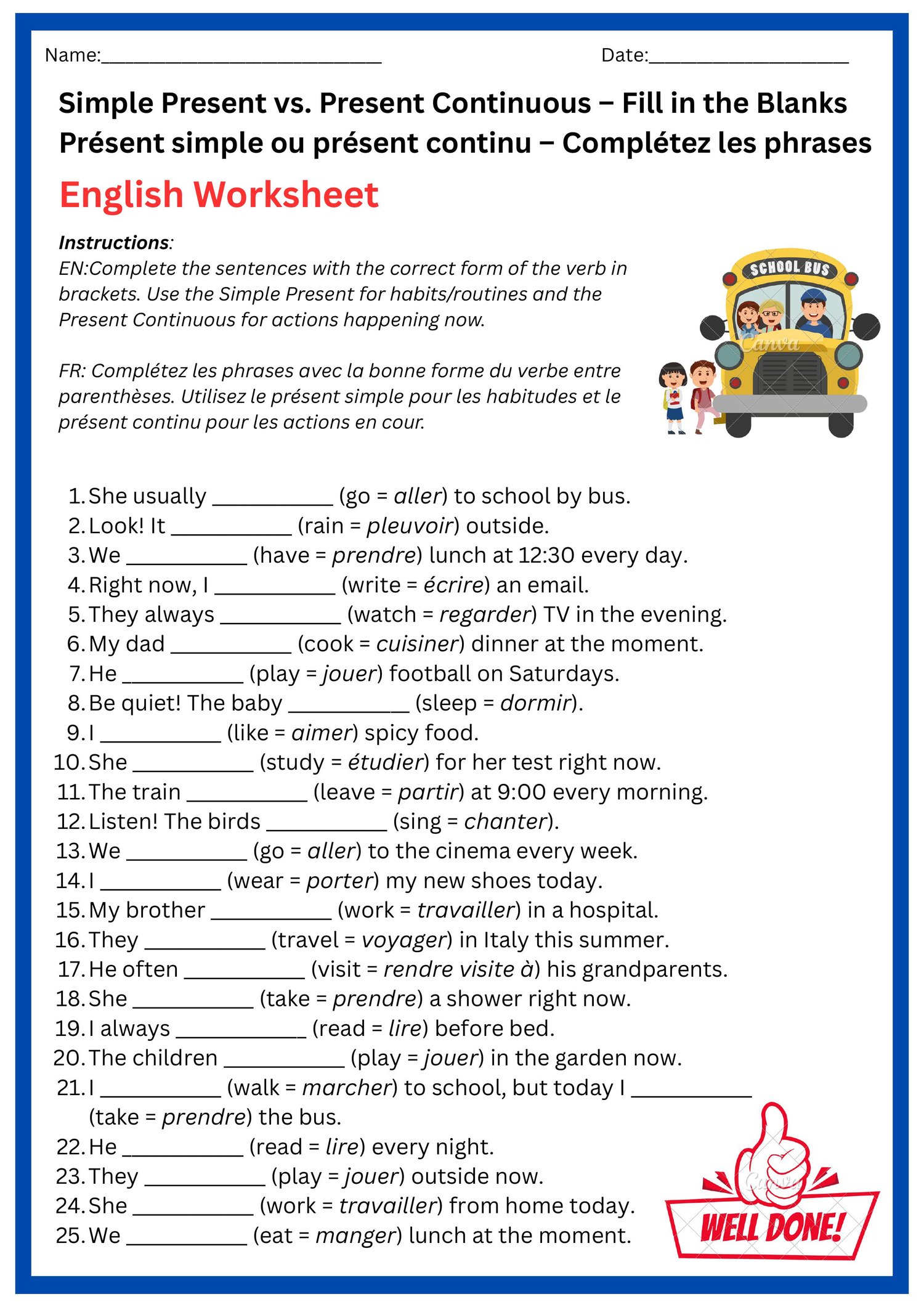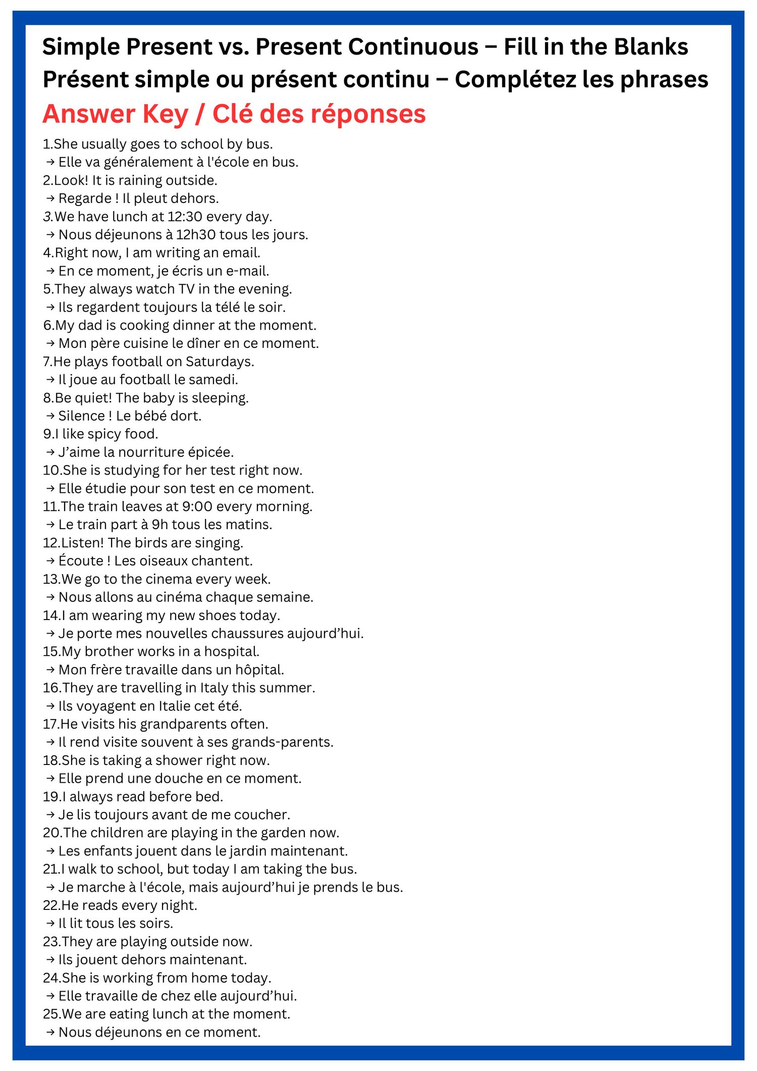 This fill-in-the-blank worksheet contains 25 positive sentences designed to help beginner to elementary (A1–A2 level) English learners master the difference between the Simple Present and Present Continuous tenses. Each sentence includes a helpful French translation, making it perfect for French-speaking students learning English. This resource is ideal for classroom use, tutoring, or self-study. An answer key is included to facilitate easy correction and reinforce learning. Boost your English grammar skills with this clear, engaging worksheet today!