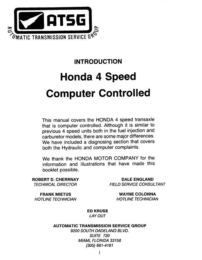 This manual covers the HONDA 4 speed transaxle that is computer controlled. Although it is similar to previous 4 speed units both in the fuel injection and carburetor models, there are some major differences. Included is a diagnosing section that covers both the Hydraulic and computer complaints.