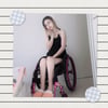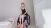 Zoe was wearing black stockings, she moved her legs, she sat on the wheelchair. She took off her stockings.