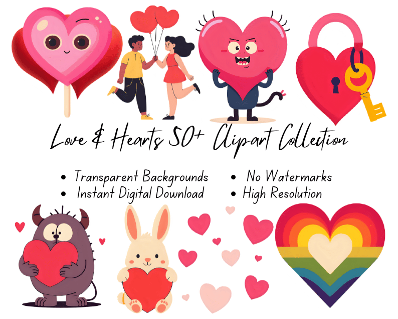 Love & Hearts 50+ Clipart Collection | High-Resolution Digital Printables | Instant Download | No Watermark