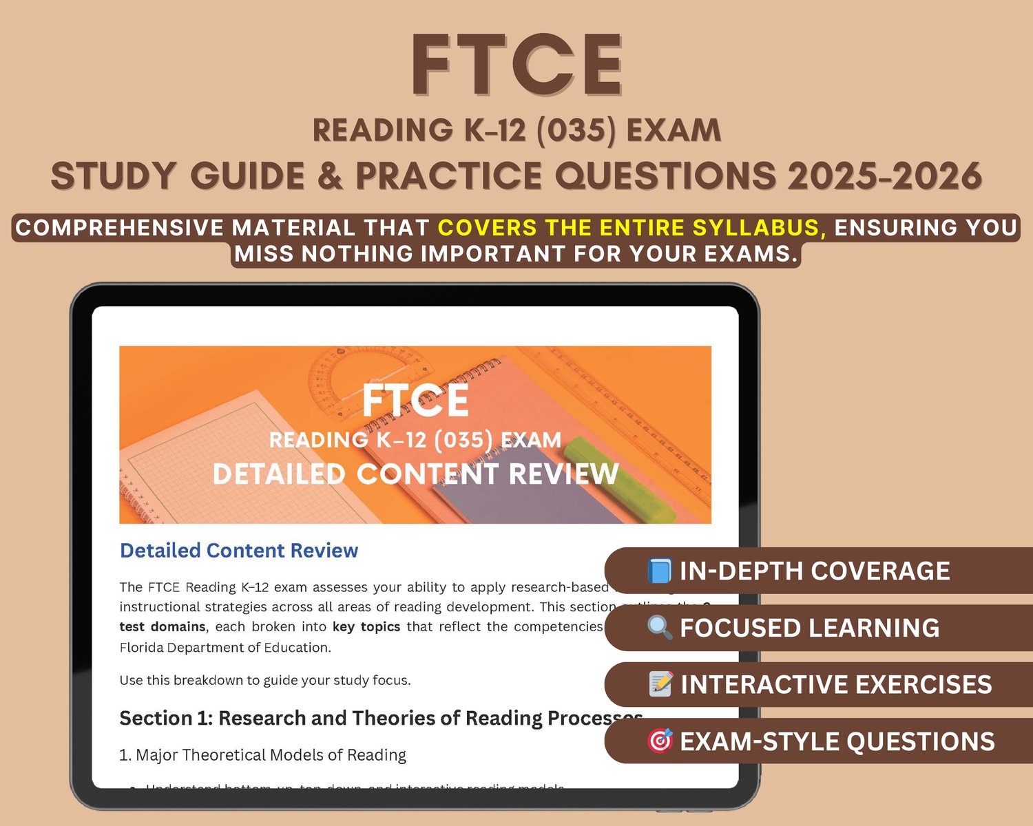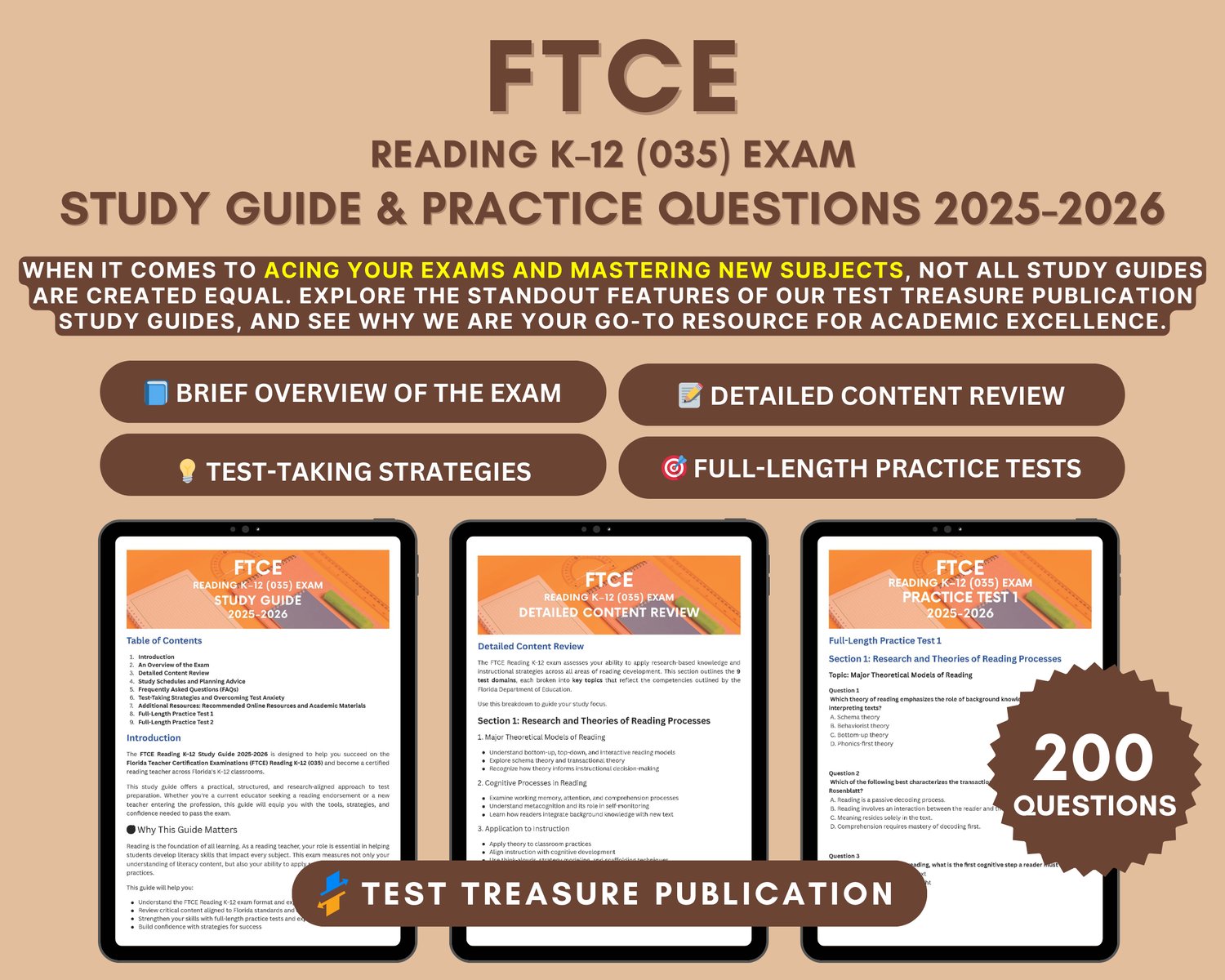 Prepare confidently for the Florida Teacher Certification Examinations (FTCE) Reading Kβ12 (035) with this all-in-one digital study guide, designed to help educators pass the exam on their first attempt. Ideal for aspiring Florida reading teachers, literacy coaches, and educators seeking reading endorsement.
