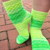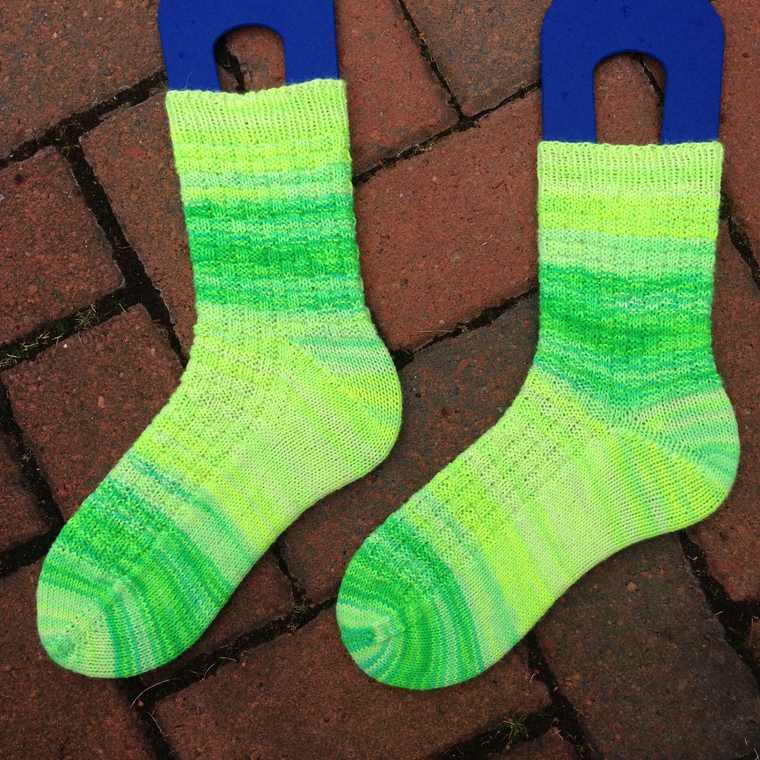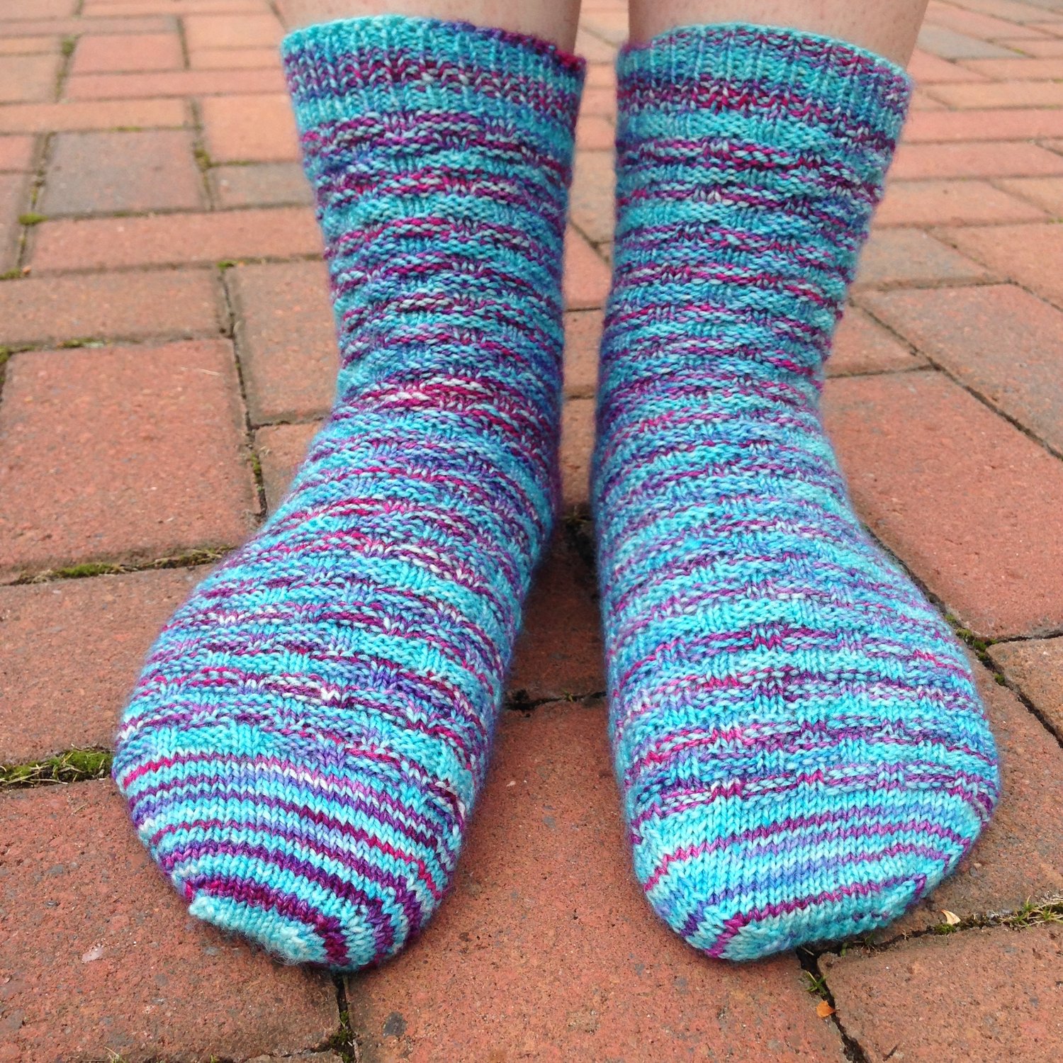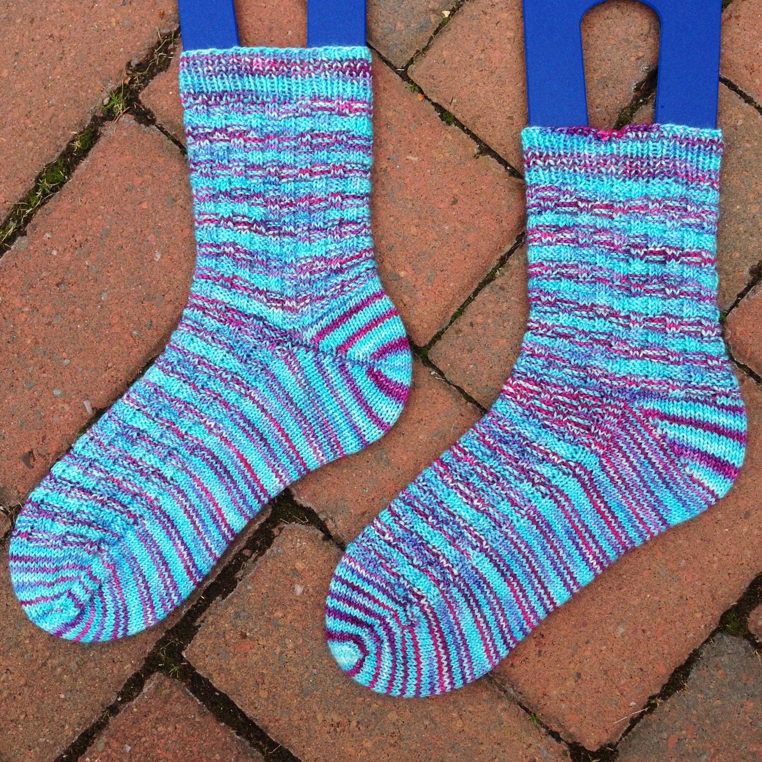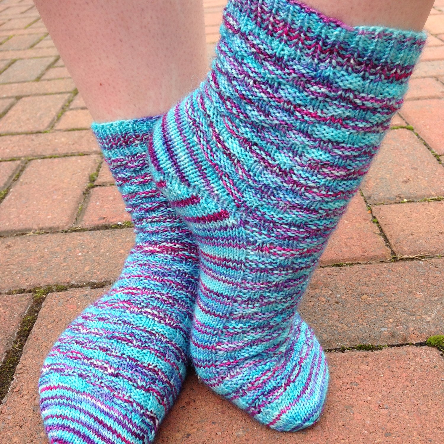 The socks are knit using Judy’s Magic Cast-On, ending with Jeny’s Surprisingly Stretchy Bind-Off, or using the German Twisted Cast-On, ending with Kitchener stitch.