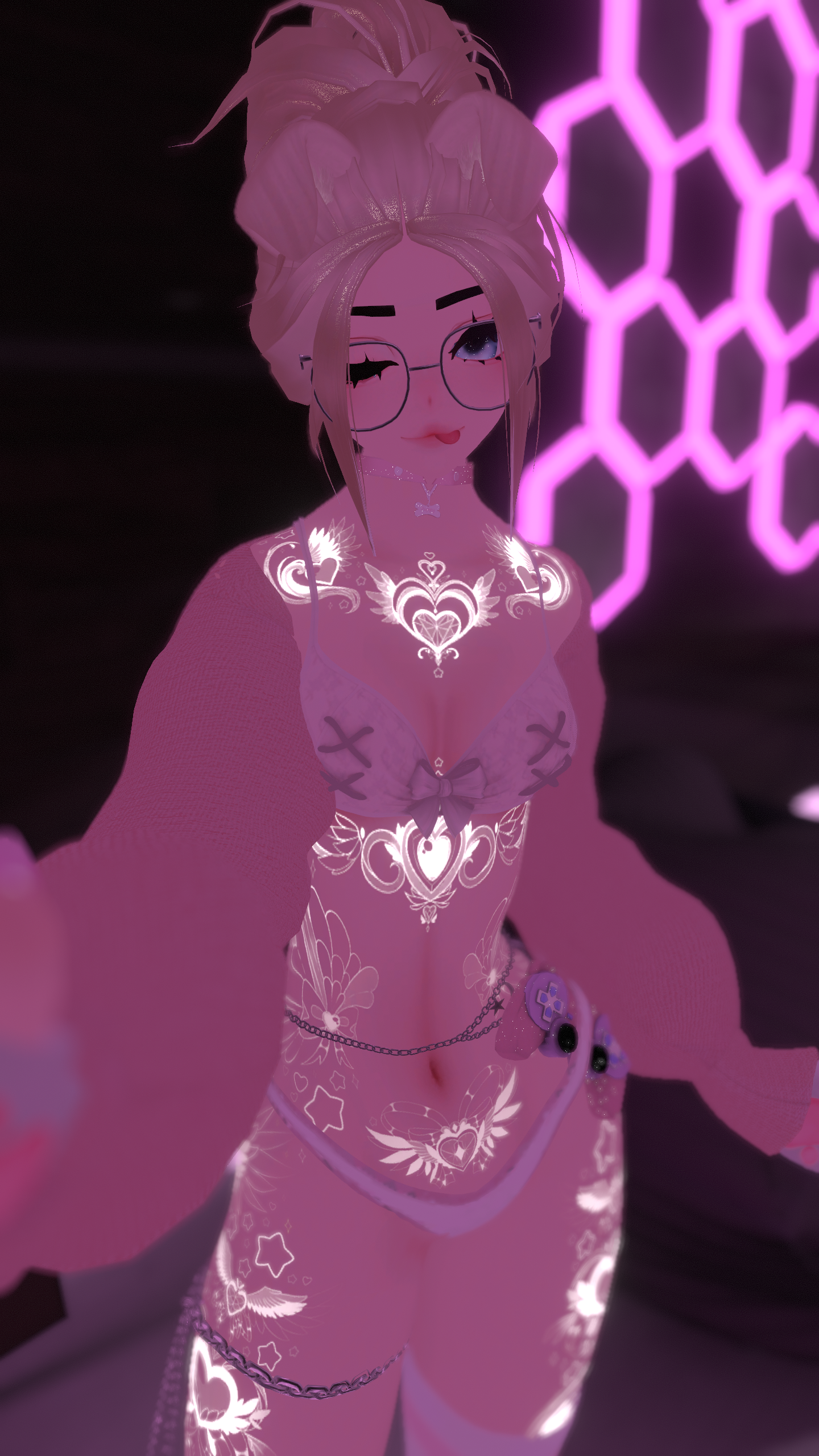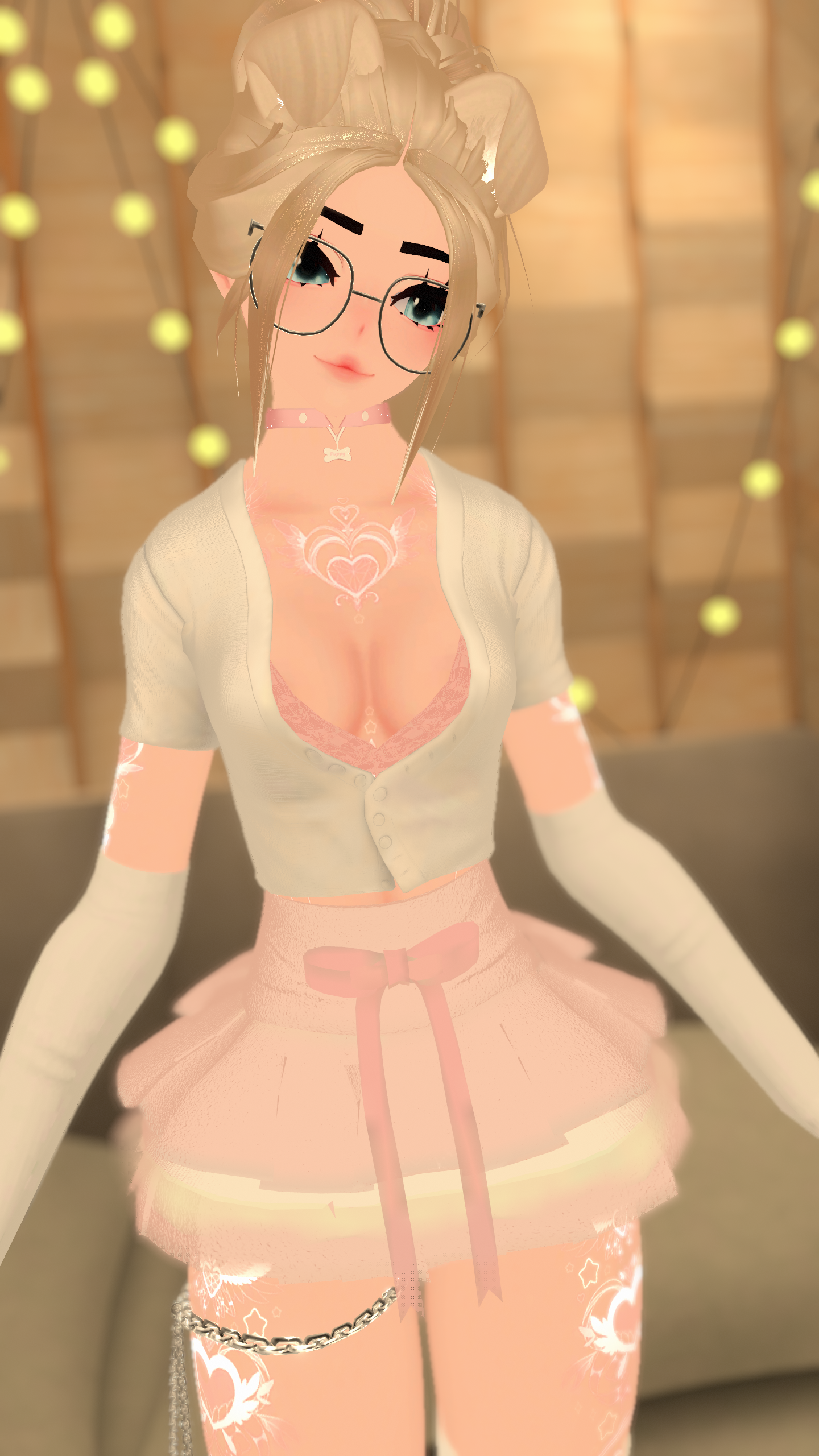 Base(EDITED BY ME DO NOT REUSE): pandaabear | Head(EDITED BY ME DO NOT REUSE): sweaty/kri's head | Glasses: Kri | Eye tex: zinpia | Hair: NessyVR | Body tex: Uni#1369 smoluni | Gamer girl set: berryvee | Puppy set: cupkake | Sweater: cupkake | Bra: rinebean | collar: xelyo | Belt: cosmichai | Thigh highs: beardiechan | sneakers: apyr | Gamer chain: peachanas | top: apyr | Skirt: panda cute outfit | Gloves: rinebean | Menu icons: Uni#1369 smoluni | crouch: kisu | Heart hands: yuena#1004 | Sit: gireison | Tattoos: Uni#1369 smoluni