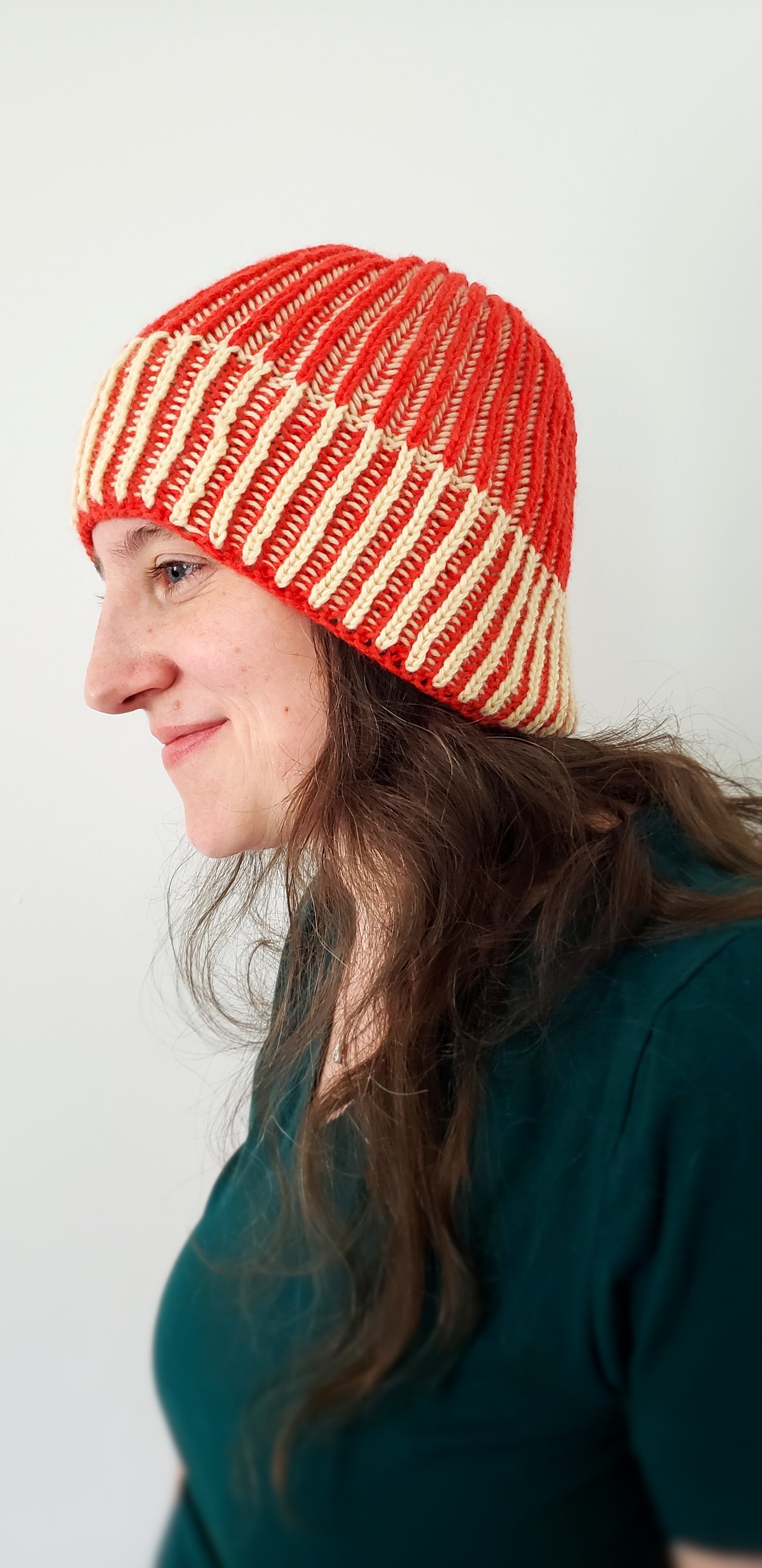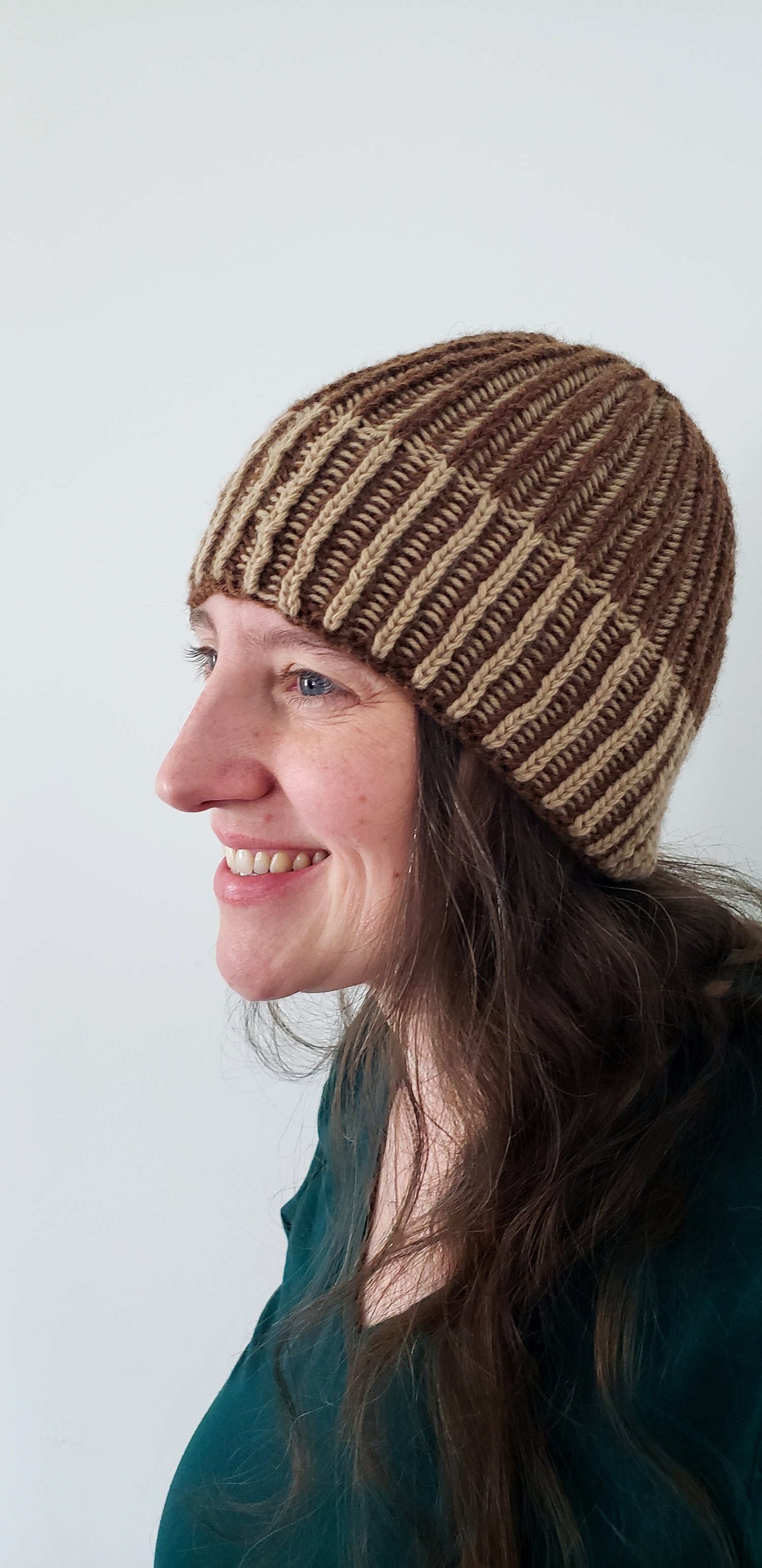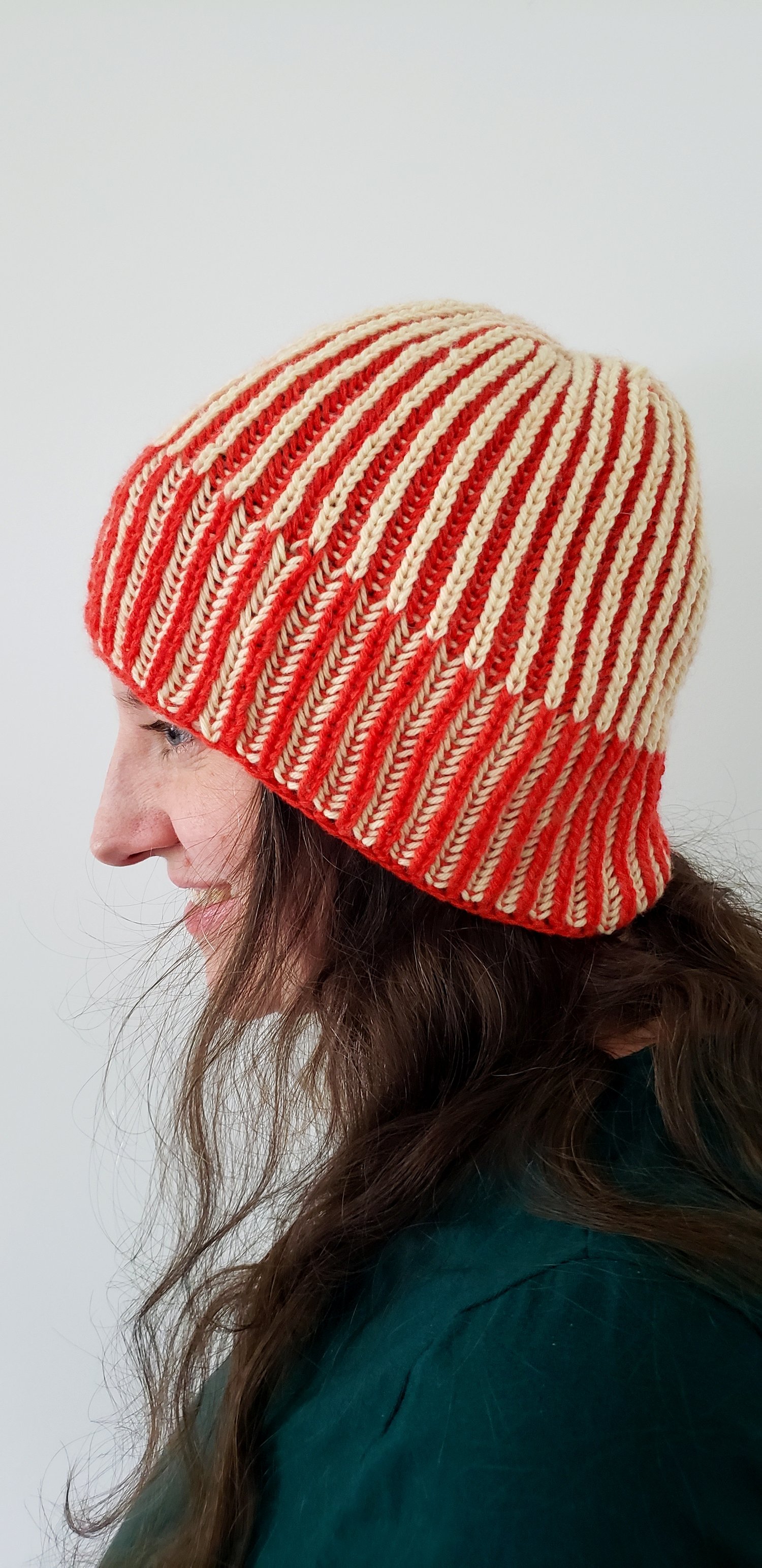 When I designed this hat, my intention was to make a wardrobe staple that would allow beginner brioche knitters the chance to expand their skills. Umbra is knit in the round from the bottom up, using only basic brioche stitches until the crown decreases (and then only one type of decrease). Umbra can be knit exactly as to pattern, but it’s also infinitely customizable. You can have as many (or as few!) stripes as you like with just two colors, or go stash-busting and add in as many color changes as you want! Plus, this hat is completely reversible! The yarn I chose for my samples, The Lamb & Kid Tod, is an amazing blend of yak and cashmere, soft and lovely, and comes in an abundance of beautiful hues for endless color pairing fun!