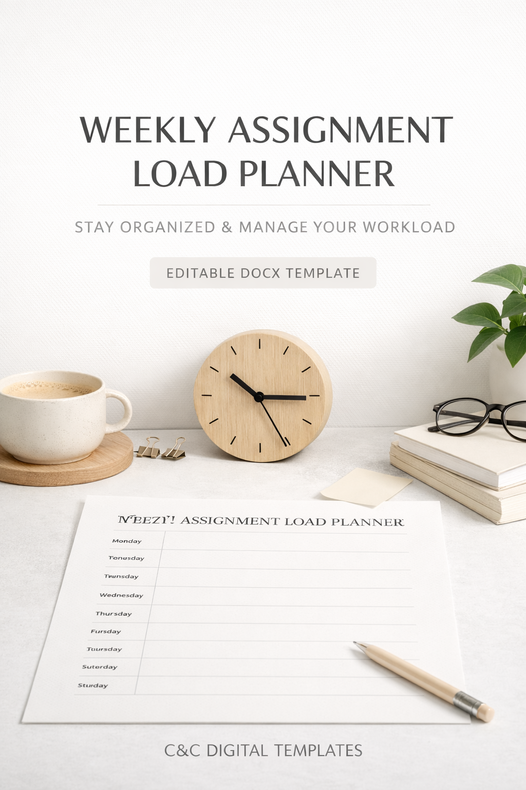 Organize assignments clearly across the week with this weekly assignment load planner. Ideal for students managing multiple subjects who need a simple, structured overview of deadlines and workload. Minimalist Nordic layout, editable DOCX format.