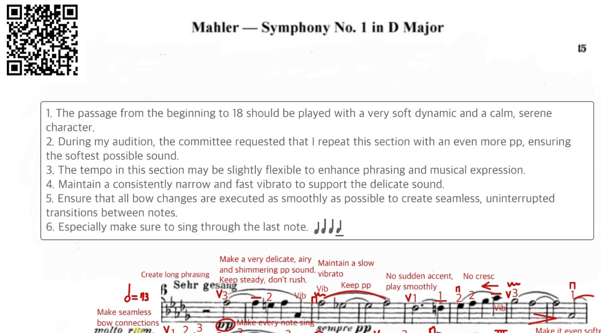 Each excerpt includes my personal bowings, fingerings, phrasing, musical ideas, audition tips, and practice strategies — refined through years of performing and auditioning with top orchestras.