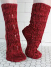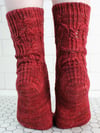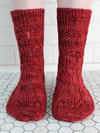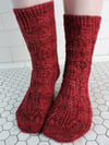 These socks are worked from the cuff down. The pattern includes written instructions and charted stitch patterns. The pattern is written for woman's small/medium and medium/large sizes.