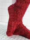 These glamorous socks combine small sections of twisted stitches, cables, and lace to create an intricately feminine design. These socks would be perfect for that special occasion when your feet need to feel extra pretty!