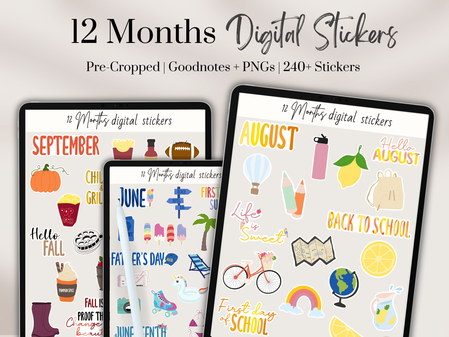These 12 month digital stickers are perfect to organize your planner or any digital tablet! Our stickers are pre-cropped and easy to use straight from the sticker book provided. These digital monthly planner stickers can be used for school planners, work planners, daily reminders and more.