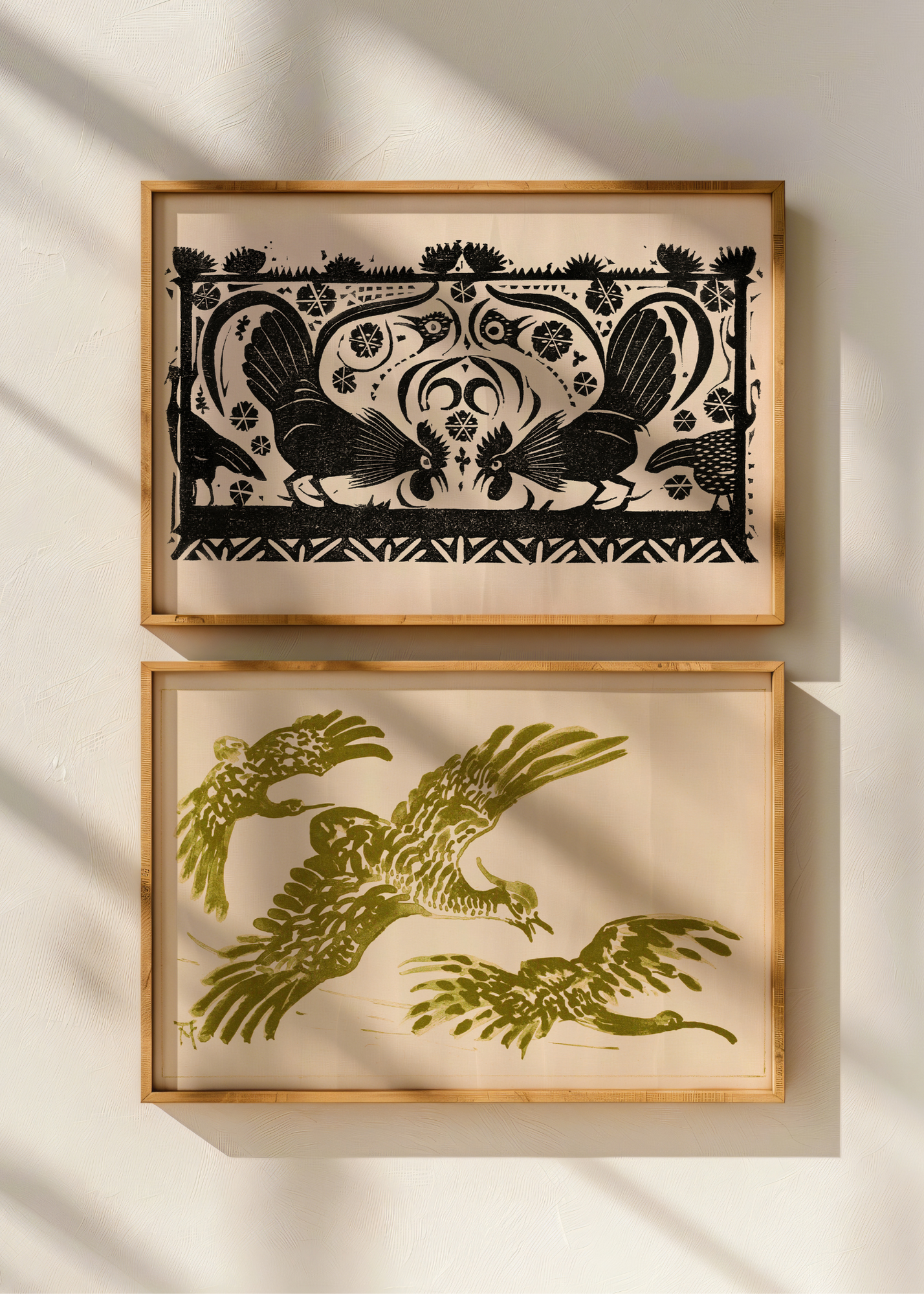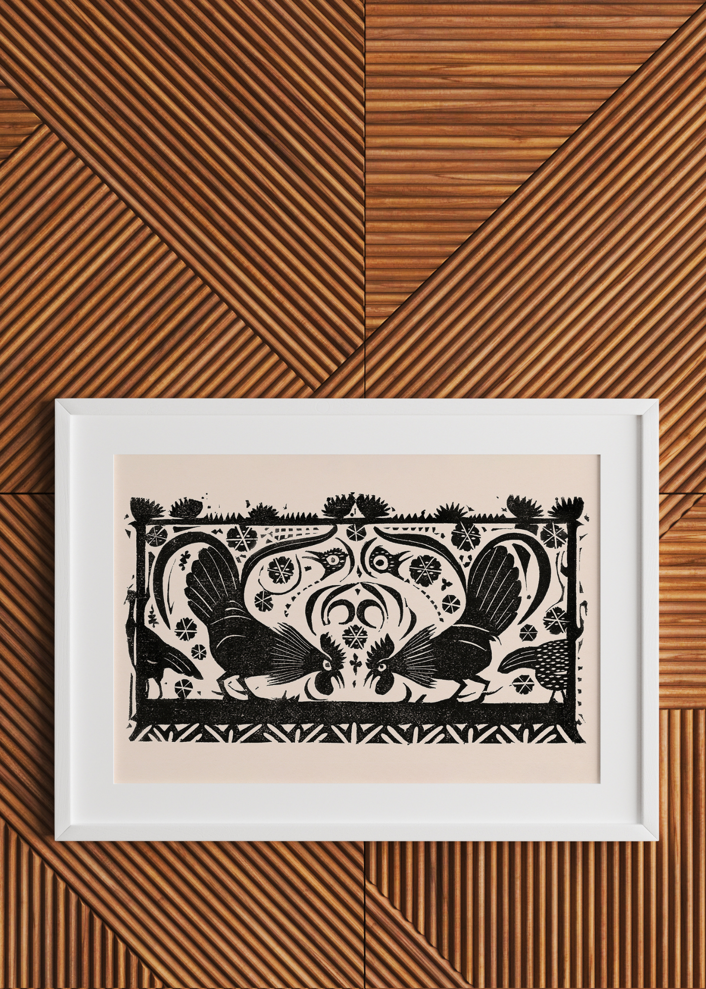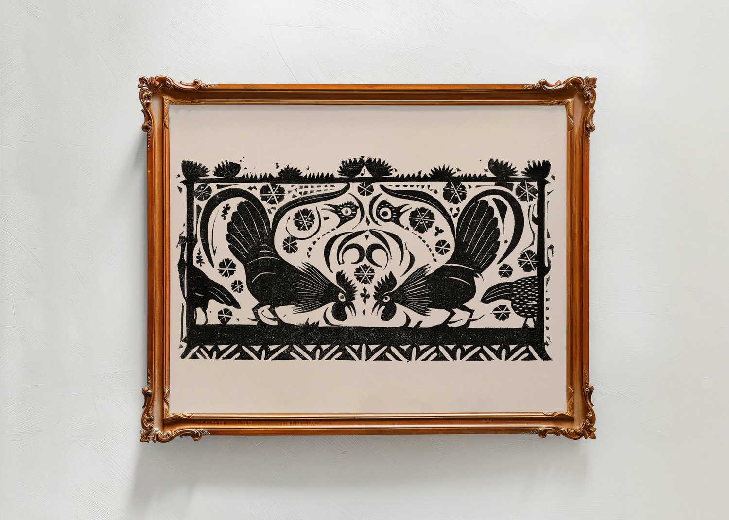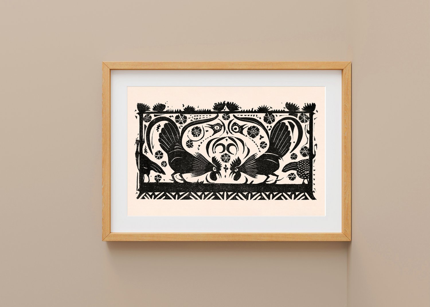 Roosters— In this intricate composition, Gerrit Willem Dijsselhof weaves a tapestry of nature's quiet mysteries.A proud rooster stands prominently, its form rendered with graceful lines and subtle detail.Surrounding it, the foliage conceals hidden creatures—each nestled within the undergrowth, awaiting discovery.The interplay of visibility and concealment invites contemplation, drawing the viewer into a serene world where every element holds a secret.Dijsselhof's delicate touch and harmonious design reflect the essence of the Art Nouveau movement, celebrating the elegance found in nature's hidden corners.