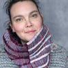 Size 1: the cowl is single thickness and worked in the round from top to bottom, and the bottom edge is finished with a smart i-cord cast-off. This size uses half of a full 100g skein of each colour – you can choose which is one is the MC and which is the CC.